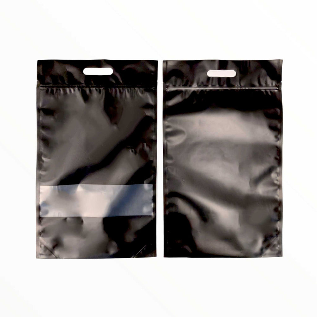 Perfect for retail food storage and non-perishable items, these stand up packaging bags are matte black, with a clear window and feature 3 layers of protective material for longer food shelf life.