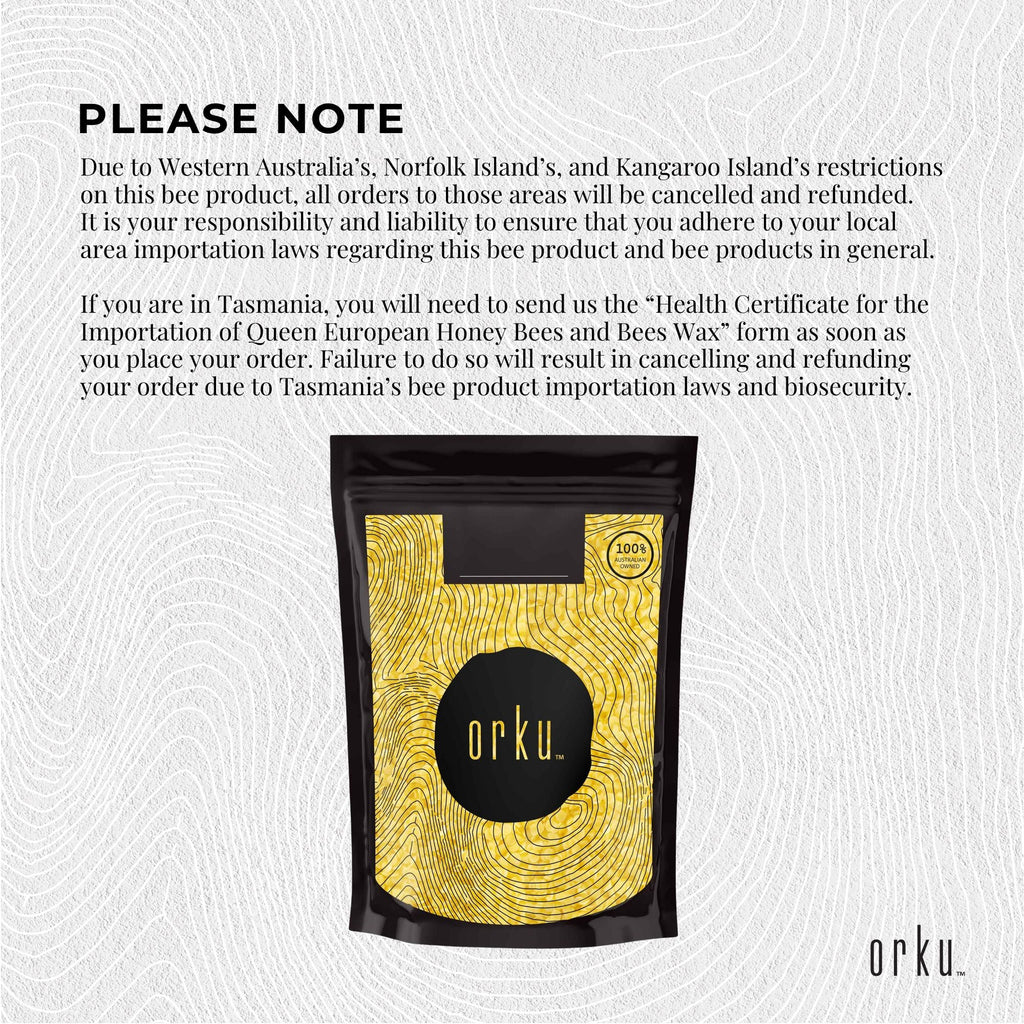 Due to Western Australia’s, Norfolk Island’s, and Kangaroo Island’s restrictions on this bee product, all orders to those areas will be cancelled and refunded.