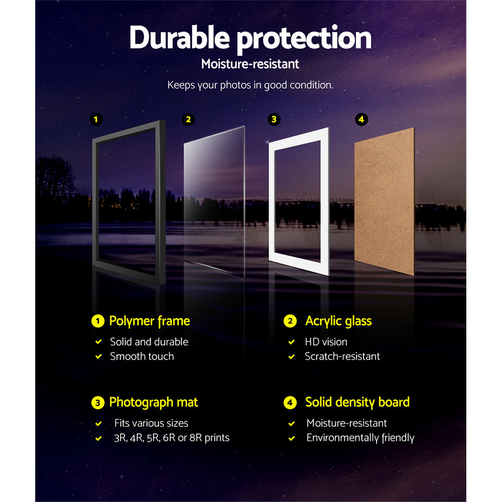Every picture tells a story. And we are sure your extensive photo collection has lots to tell. So why not frame up the interesting ones on the wall and share the stories behind them to friends and family. You can do that beautifully with our charming Photo Frame Set. Available in a set of 11, our set allows your walls to be graced with fascinating stories and memorable moments from your treasured photographs. Arrange them in any way you like. Portrait or landscape, the framed photo feature wall is a conversational piece in its own right. Suitable for a range of photograph sizes from 3R to 8R, the frames feature a durable polymer construction with a polystyrene glass to keep your prints in good shape. The hardboard backing is also moisture-resistant. Hanging accessories are also included with your purchase.