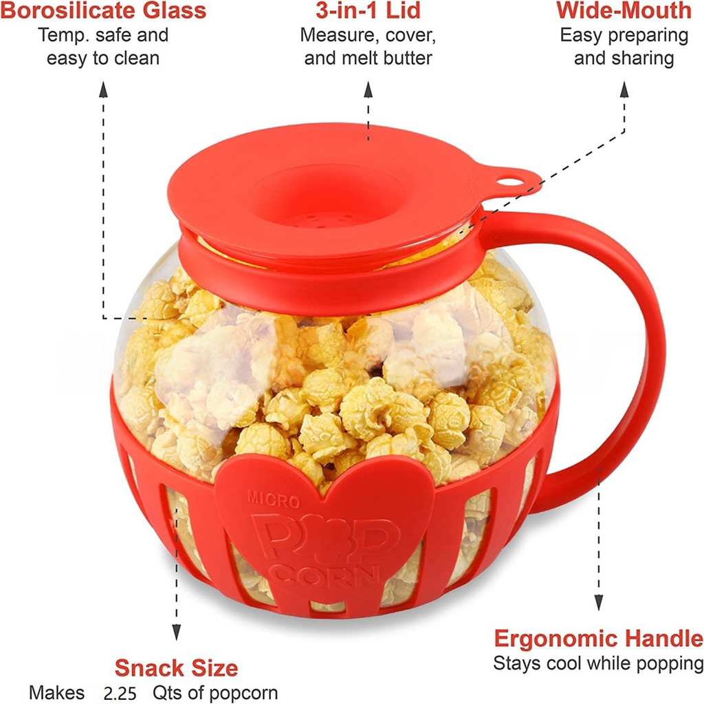 2.25QT Red Borosilicate Glass Microwave Popcorn Popper - Healthy Chemical-Free Snack Maker - Dishwasher Safe & Wide Mouth Design