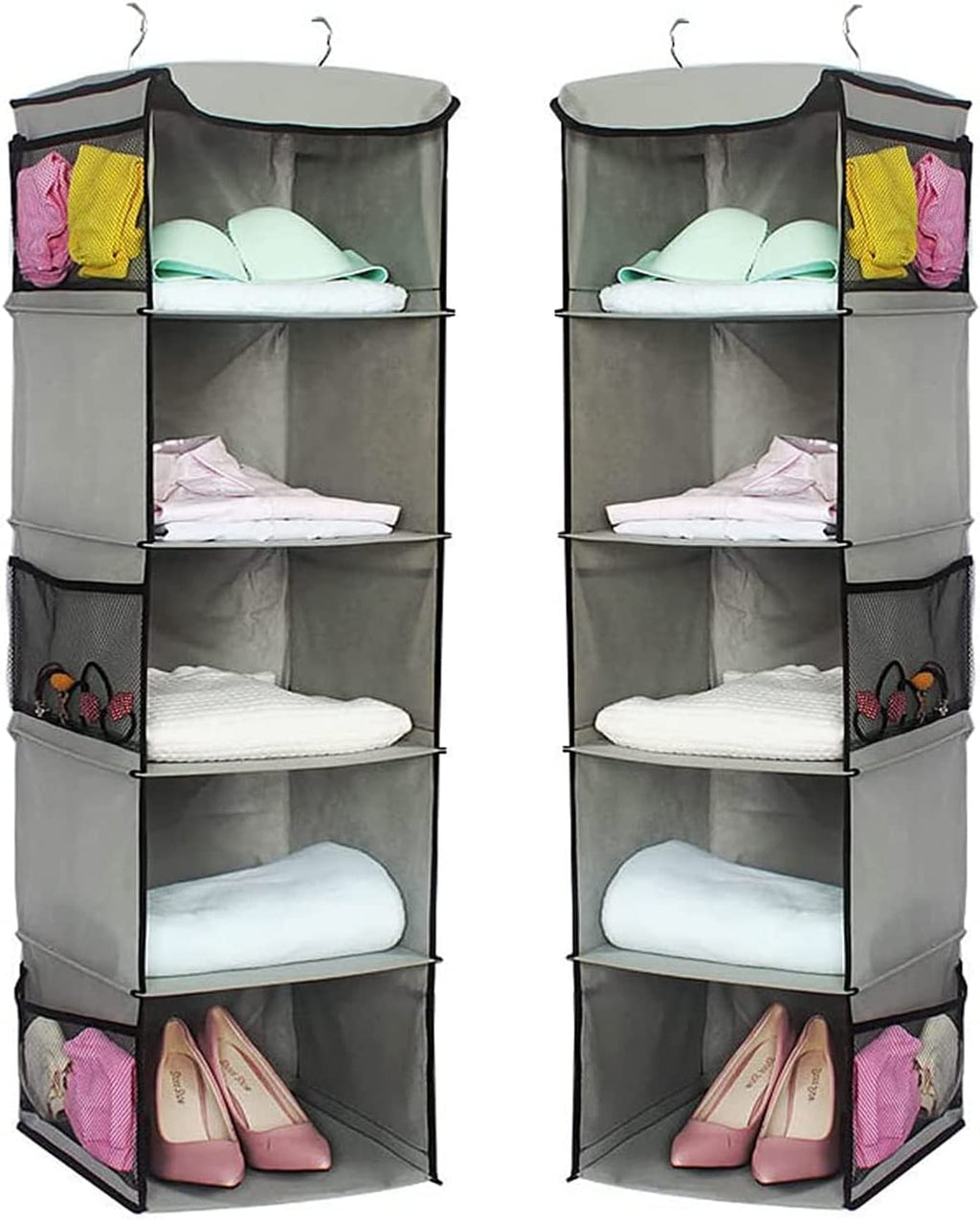 2 Pack 5 Foldable Shelf Hanging Closet Organizer Space Saver with Side Accessories Pockets for Clothes Storage