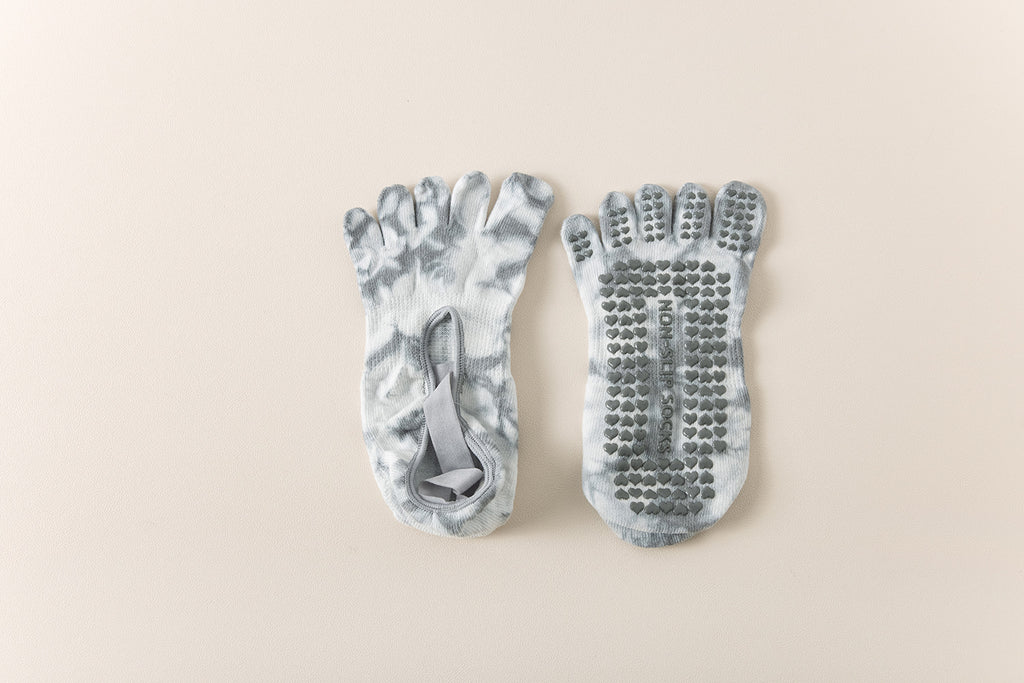 2 Pairs Grey Tie-Dye Non-Slip Yoga Socks for Women - Five-Toe Cotton Blend Socks for Pilates and Indoor Sports