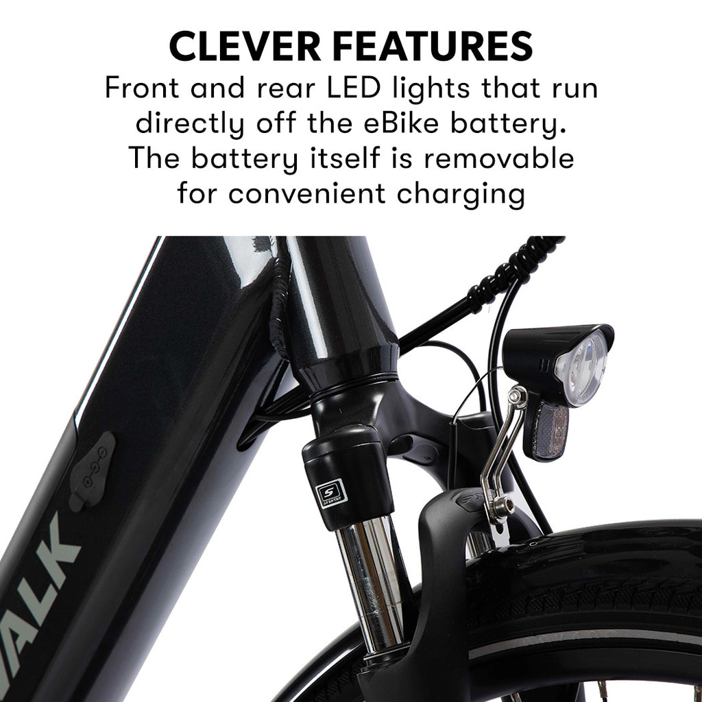 The front and rear LED lights are conveniently powered by the eBike battery. Quick release levers allow you to easily adjust the seat height. You can also adjust the handlebar and stem angle, as well as fine-tuning the handlebar height by selecting the right number of headset spacers. This ultimate commuter comes complete with mudguards, bagrack and kickstand.