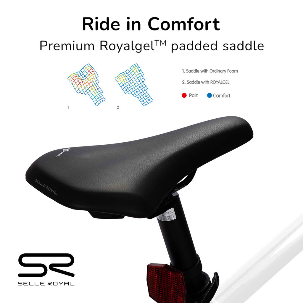 Clocking up the kilometres on a Metro 5 + e-bike is a pleasure with riding on the Selle Royal saddle which boasts a gel layer. Your palms rest on ultra-soft oversized handlebar grips and the pedals are also rubber coated for added comfort.