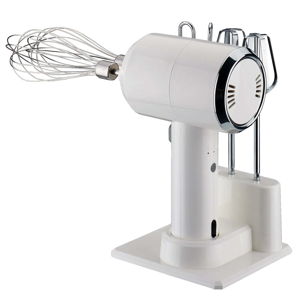 - Cordless Hand Mixer with Stand, three attachment types, three speeds with indicator lights, dual attachment slots, powerful 150 watts mixing, 15,000 revolutions per minute, cordless and rechargeable with indicator lights, dishwasher-safe attachments, easy to clean, easy to store