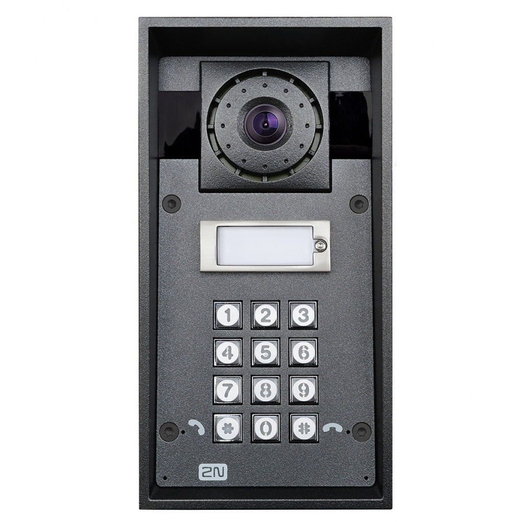 The 2N Helios 9151101CHKW is an outdoor-ready intercom that comes with one button an integrated HD camera a keypad control of two electric locks and the capability to connect an additional switch.