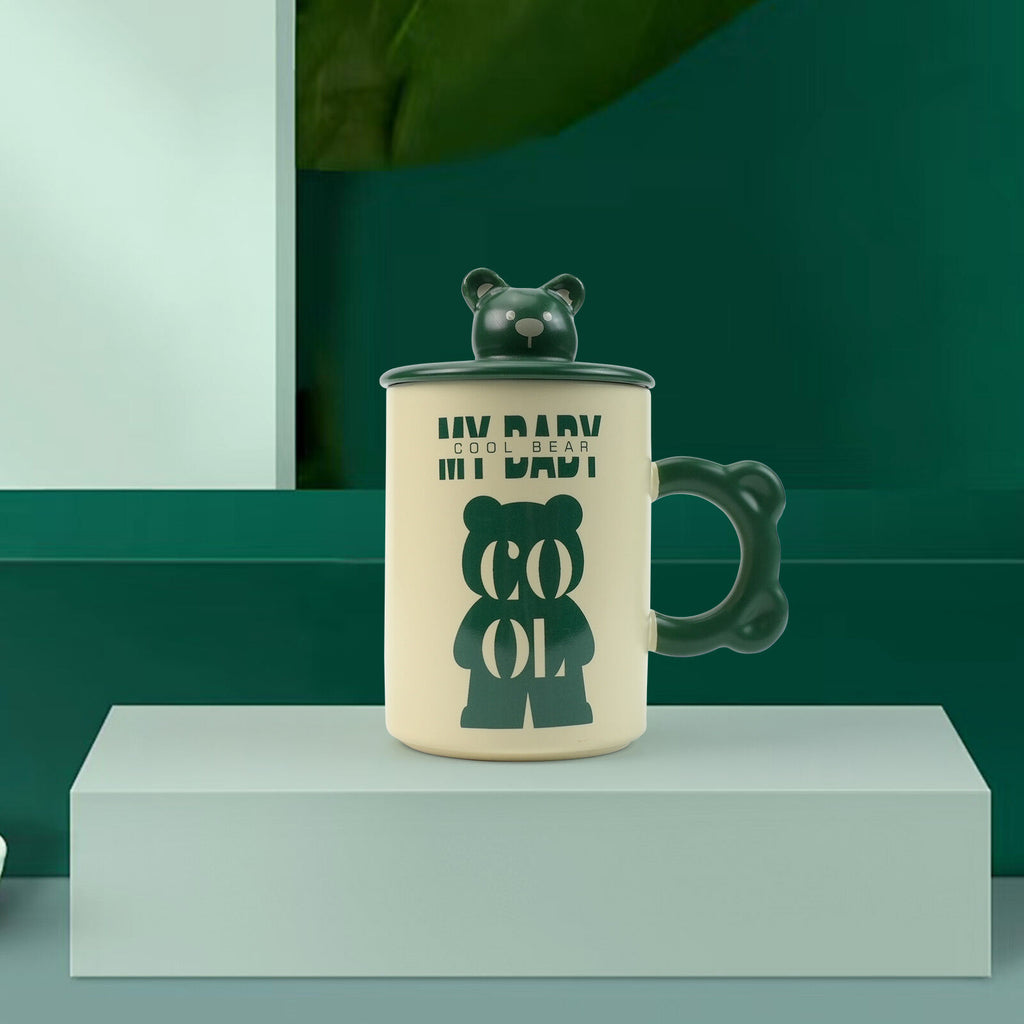 2 Set High-Fired Ceramic Porcelain Mug Set with Lid Bear Tea Spoon 400ml Green