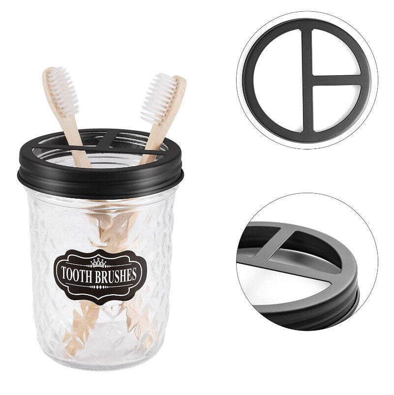 MASON JAR TOOTHBRUSH HOLDER - 16 oz wide-mouth glass mason jar with recycled 304 stainless steel lid . Three large compartments works with most sizes of toothbrushes, electric toothbrushes,toothpaste tubes, flossers, razors and more. (two 1/4 sized openings for brushes and one 1/2 sized opening for the toothpaste.) It is sturdy ,functional, easy to clean and will never rust.