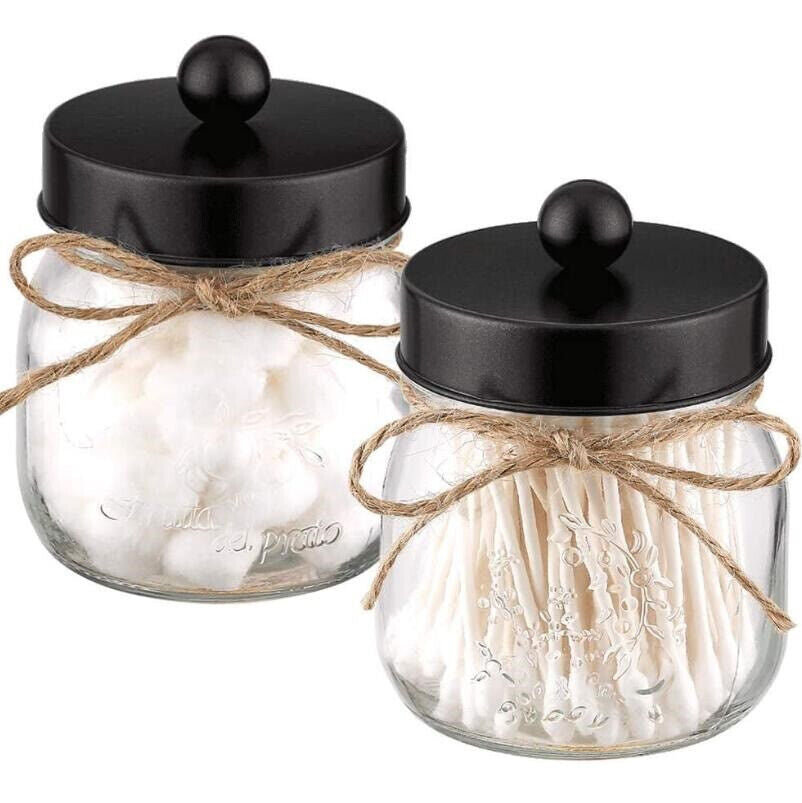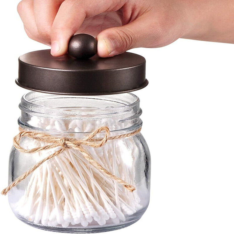 2 CUTE APOTHECARY JARS -8oz regular mouth mason jar qtip holder adds the perfect rustic charm to your bath-room. The lids are metal, rust-proof ;The jars are not sealed so you can access the items inside with one hand easily . The mason storage jars are great for cotton swabs, q-tips, cotton balls, cotton rounds,hair bands or any other bathroom necessities and accessories,but also great in home office for paperclips, rubber bands, binder clips, etc