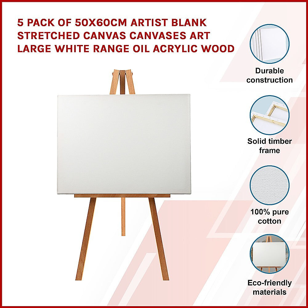 5 pack of 50x60cm Artist Blank Stretched Canvas Canvases Art Large White Range Oil Acrylic Wood