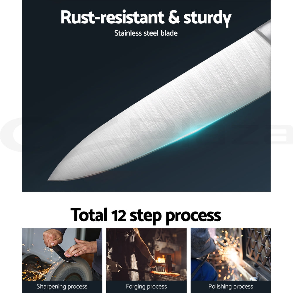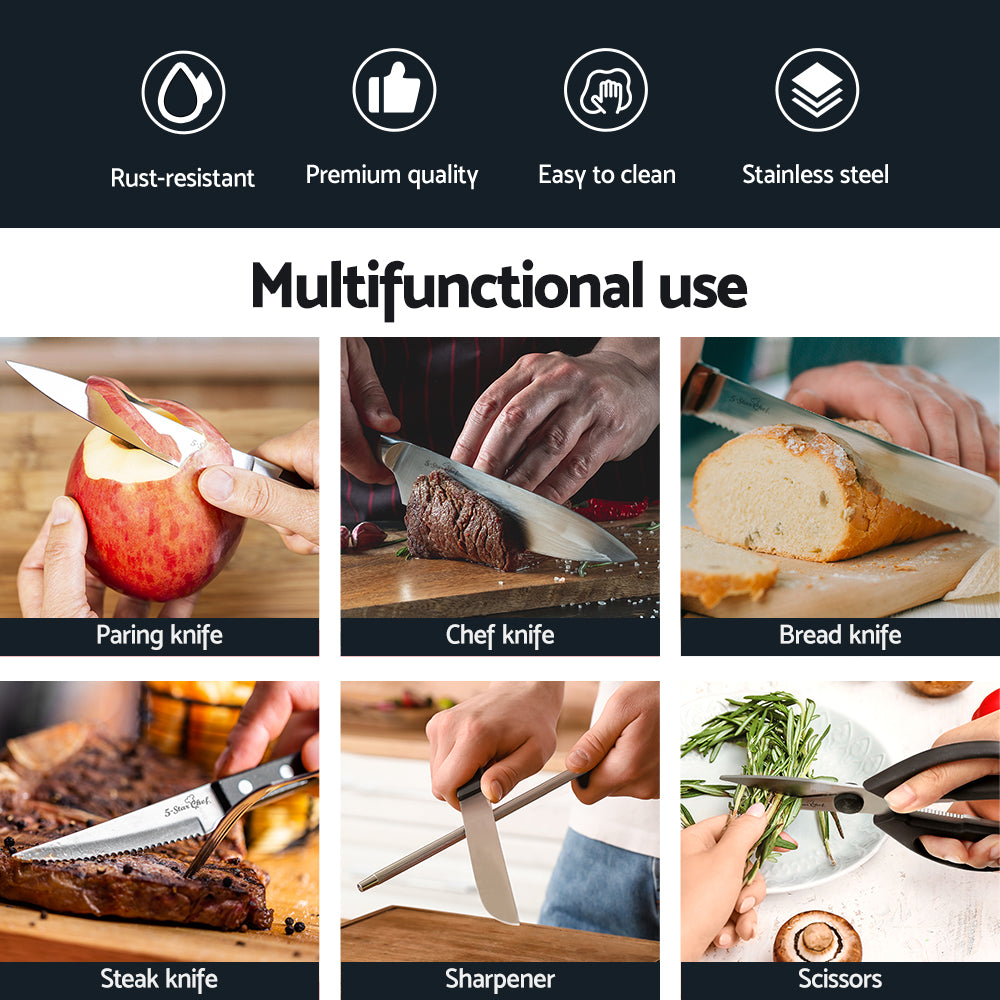 Do you love to cook? Our 14-Piece Kitchen Knife Set will keep your cooking skills sharp. The knife set comes with a chef knife, bread knife, carving knife, utility knife, paring knife, six steak knives and a wooden knife block to keep your collection organised and protected. Slice, dice, cut and gut, there’s a knife for every cooking situation. Each knife is made from quality stainless steel and is constructed from a single piece for extra comfort and protection. Unlike other basic kitchen knife sets, our knives feature a non-scratch, non-stick coating that is easy to clean and incredibly rust-resistant he knives have a well-balanced hollow ergonomic handle making them easy to hold and use. Includes a sharpener to keep your knives sharp and ready to go at all times. The knives have a hardness rating (HRC) of 53±2, making them perfect for student chefs and home cooks on a budget. With its sleek modern design, the knife set is the perfect gift for a budding chef, first homeowner, or even for yourself. Spruce up your kitchen and elevate your cooking skills today with our comprehensive 14-Piece Knife Set.