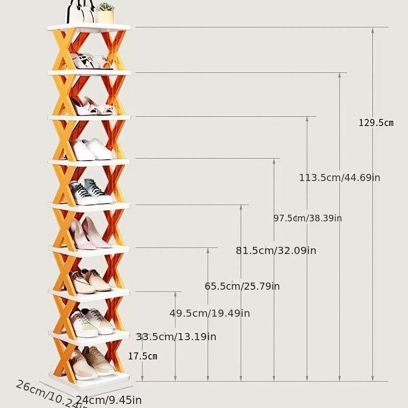 6-Tier Foldable White/Orange Shoe Rack, space-saving vertical design for entry halls, living rooms, bedrooms, closets, balconies—an essential organizing storage shelf for college dormitories.
