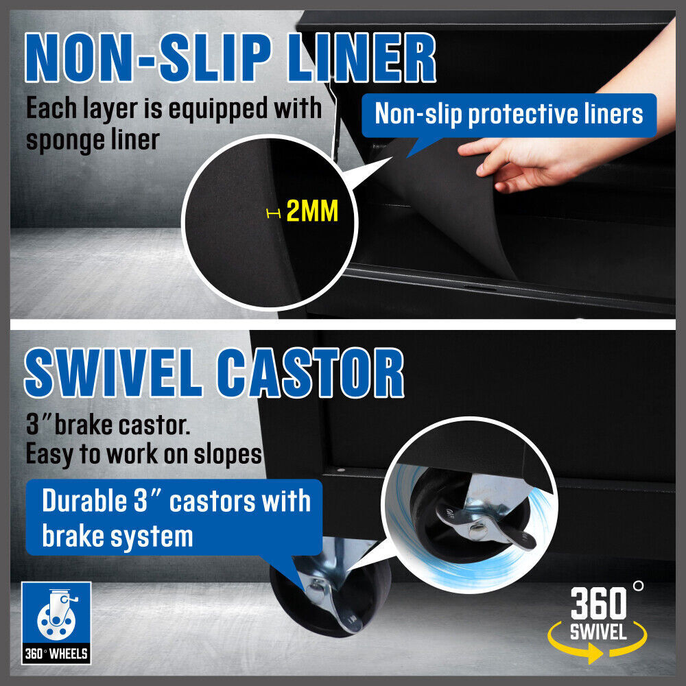 Made of powder coated steel, our tool trolley is designed to keep your valuable tools in place and has 7 drawers specifically designed to meet a variety of tool sizes. From top to bottom, each drawer slides in and out easily, with ball bearings coupled to metal drawer rollers. Each drawer is lined to protect your tools and prevent them from moving. In addition, the drawer is fitted with an upgraded camera lock for added security. The car is equipped with omni-directional casters for easy omni-directional movement and fast standing speed. The upper and lower cabinets can be separated, can the upper cabinet can be placed in the bottom cabinet. Features: 7drawers Thick high tensile powder-coated steel Sturdy construction Smooth ball-bearing slides Premium cam locks with keys 4 castors (with 2 lockable) Sturdy handle Non-slip liners Specifications: 7-drawer Trolley