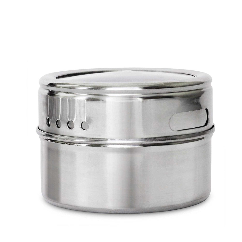 • 9 piece stainless steel spice jar rack with magnetic base and metal plate.