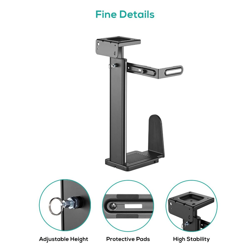 The activiva ACA-MNT-CPU01K PC and Gaming PC Case holder offers easy setup and stability. With width, depth, and height adjustments, it accommodates a variety of PC sizes and shapes. It can be mounted under the desk or on the wall, saving space and keeping your PC dust-free, and supports up to 20kg.