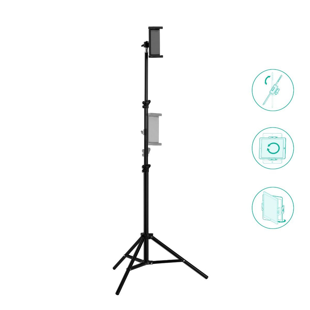 A foldable, lightweight, easy-to-use height-adjustable tripod with integrated tablet/phone holder for viewing your device at a tailored display height, suitable for tablet display, streaming/recording, music note stand, etc.