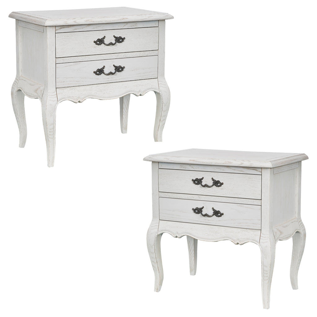 Designed in a vintage style, this 2pcs 2-drawer bedside tables give an elegant look to your bedroom. The drawers have solid oak fronts and full extension runners. Its structural frame is made of sustainably harvested solid and veneered oak wood. Black metal handles make it look stunning. Standing strongly on solid wood cabriole legs, the fully assembled furniture in Antique White Distressed goes well with a variety of interior decor styles, and it comes with a one-year warranty. It has dimensions of W60 x D38 x H60 CM.