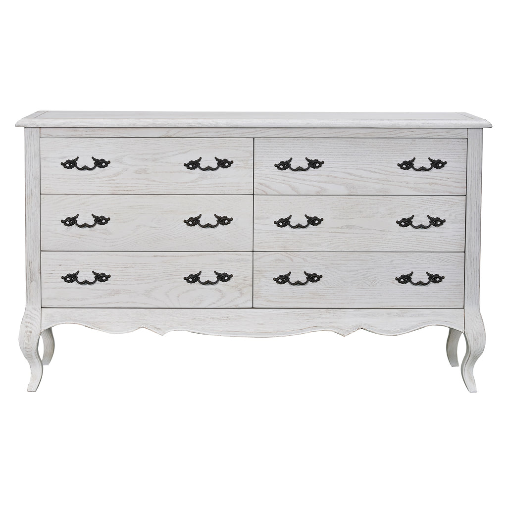 Designed in a vintage style, this dresser-mirror set gives an elegant look to your bedroom. The dresser has 6 spacious drawers. The drawers have solid oak fronts and full extension runners. Black metal handles make it look stunning. The set includes the best quality annealed glass mirror. This particular glass provides the mirror with great durability and strength. The set’s structural frame is made of sustainably harvested solid and veneered oak wood. Standing strongly on solid wood cabriole legs, the easy-to-assemble furniture in Antique White Distressed goes well with a variety of interior decor styles. It comes with a one-year warranty. The dresser and mirror have dimensions of W140 x D45 x H82 CM and W90 x D5 x H112 CM.