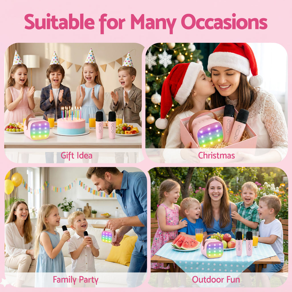 Turn any space into a stage with our Mini Portable Karaoke Machine. Designed for music lovers of all ages, this compact powerhouse combines high-fidelity sound with dazzling light effects to create an unforgettable party atmosphere. Whether you're hosting a backyard bash, a family birthday, or just a fun night in, our dual-mic system ensures everyone can join the performance. Simple to use, easy to carry, and packed with professional audio features, it's the excellent way to bring joy and music to your home.