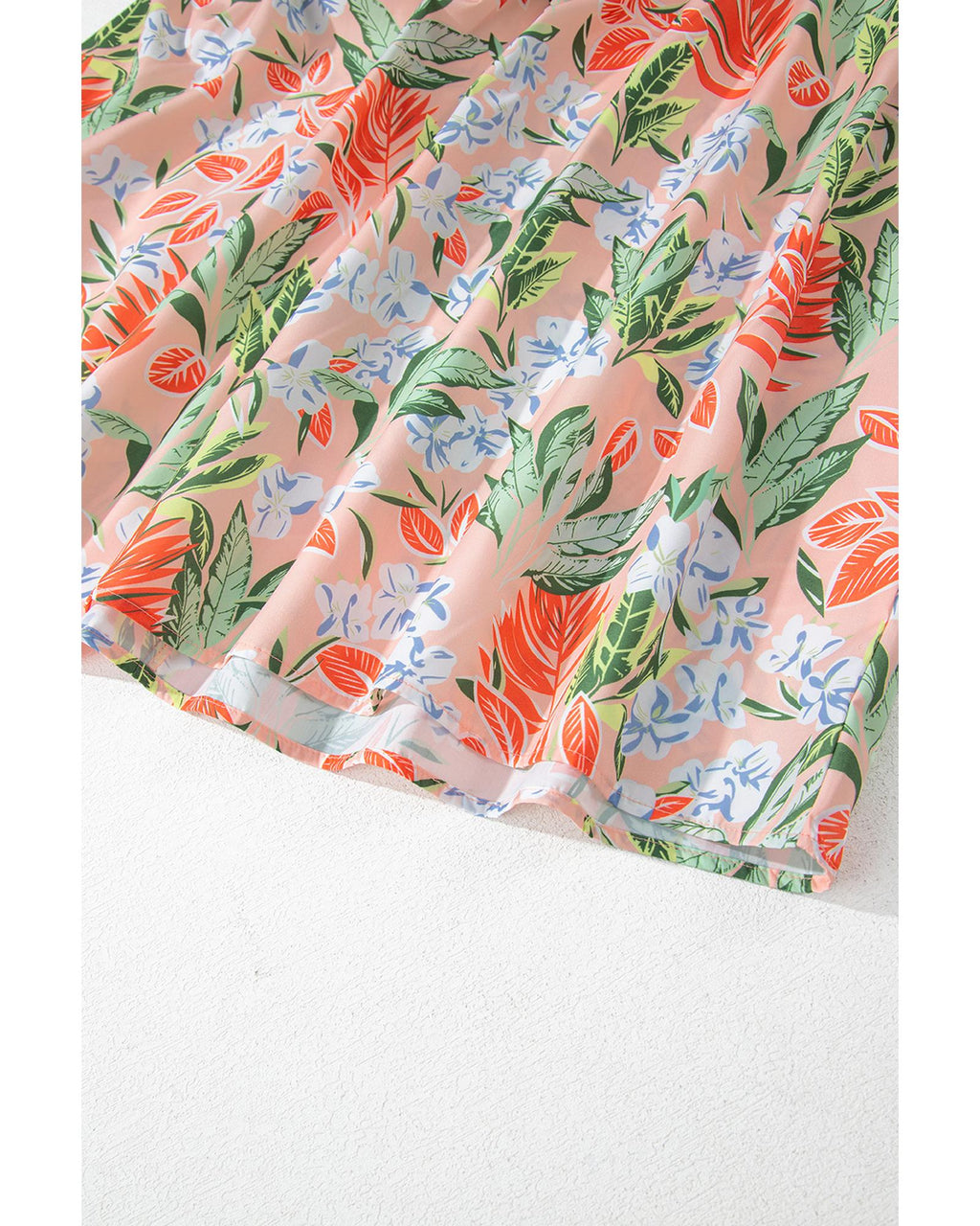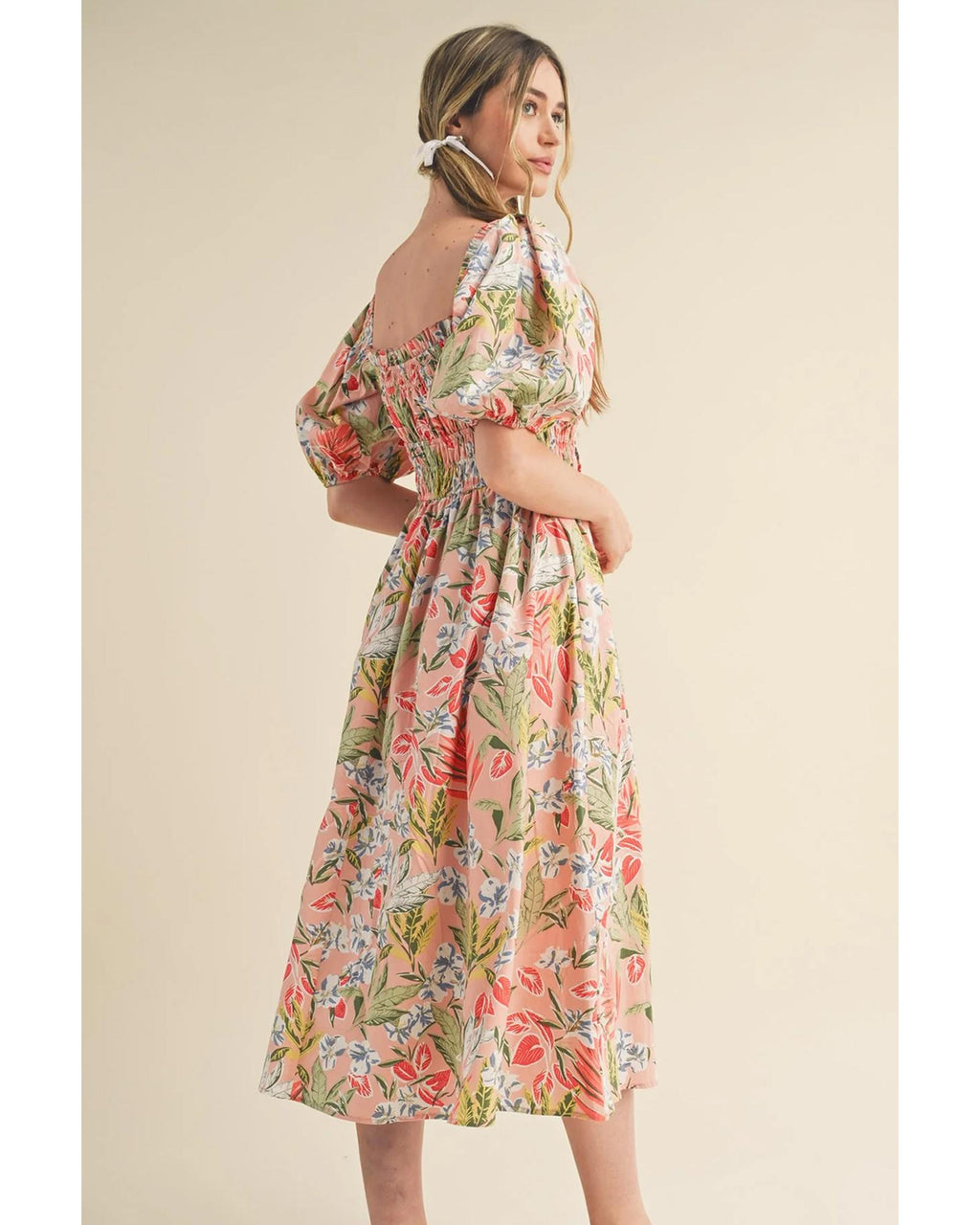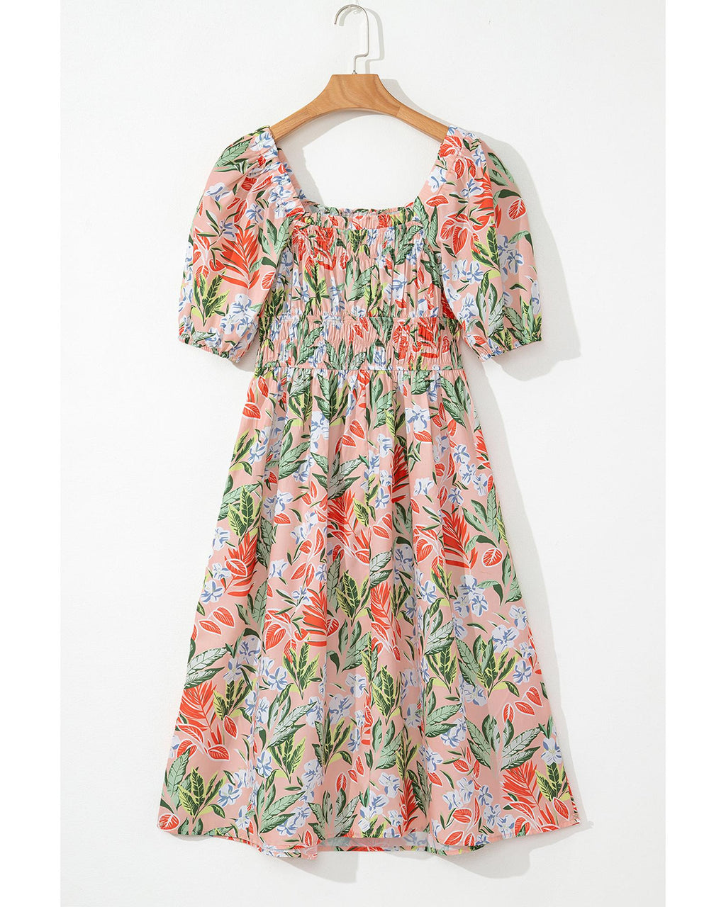 • Apricot Pink Floral Smocked Bust Bubble Short Sleeve Maxi Dress