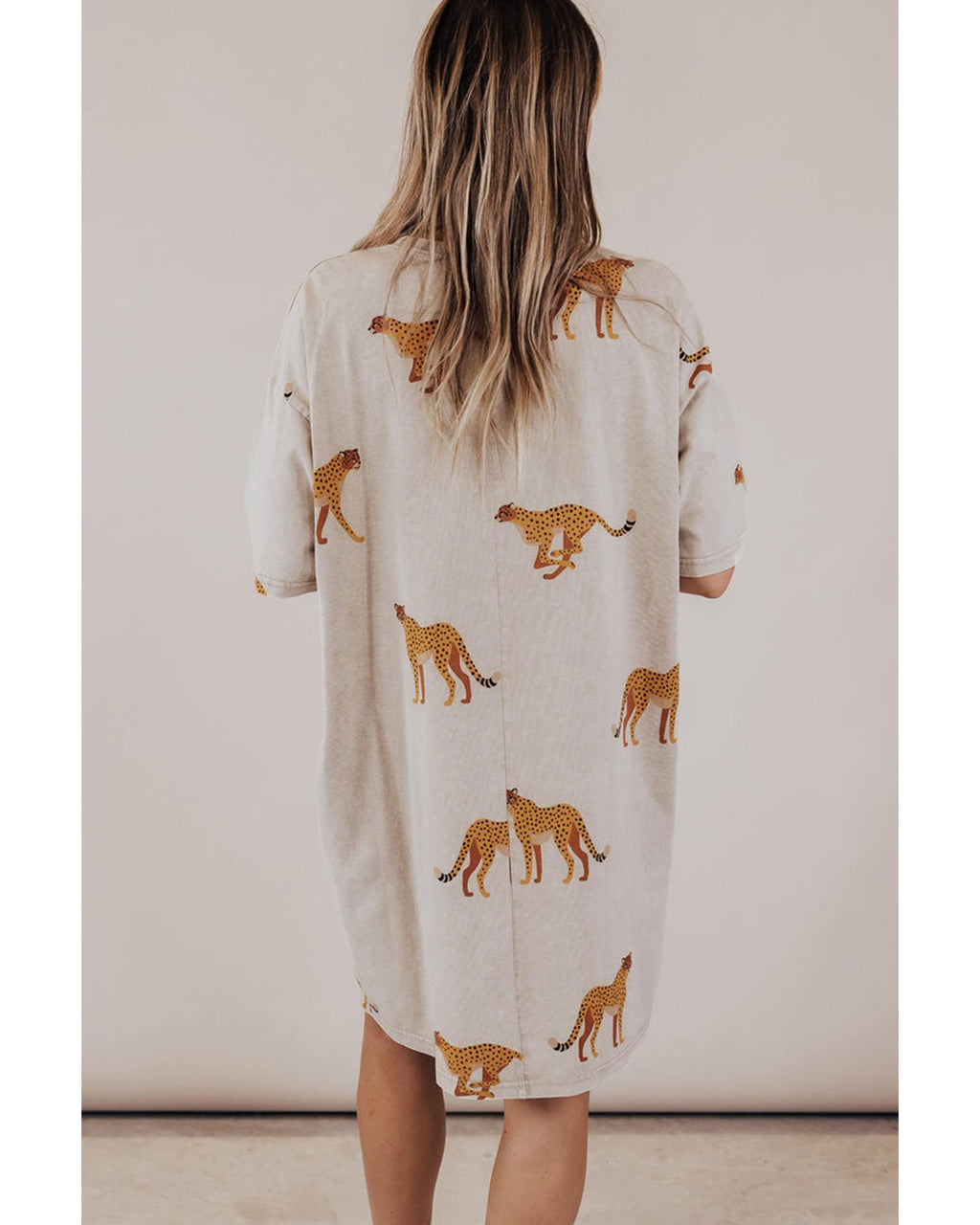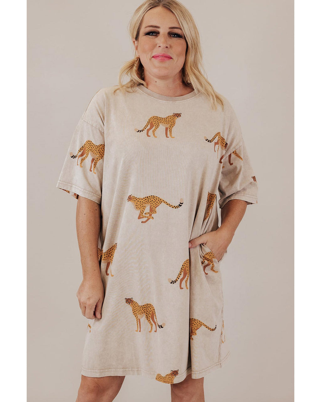 Apricot Plus Size Cheetah Print Side Pockets T Shirt Mini Dress - 2X