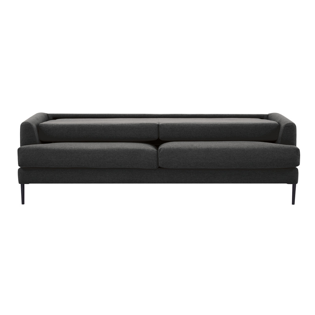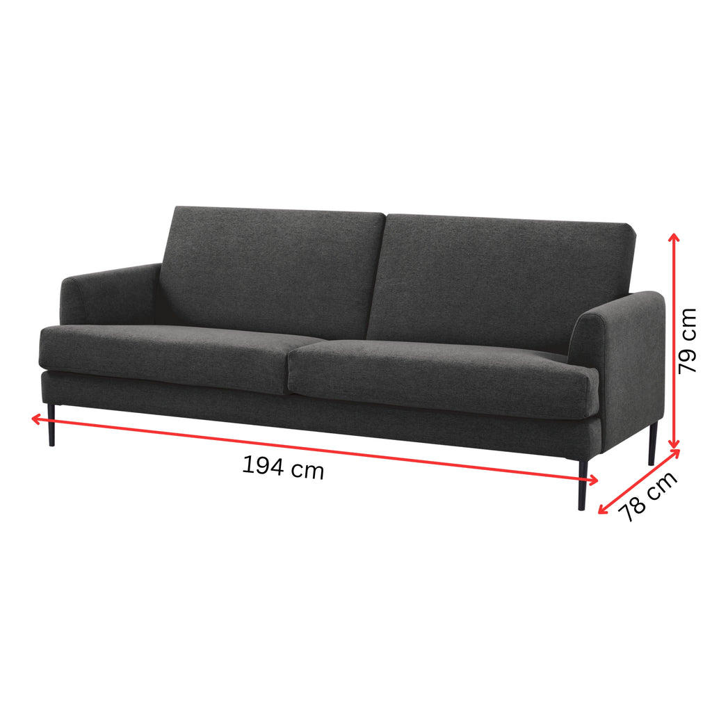 This beautiful sofa in charcoal colour assures total comfort. The Scandinavian-style furniture is upholstered in a plush upholstery made of high-performance 100% polyester. The upholstery has a smooth fit due to the intact tailoring on the frame. The solid pine wood and plywood frame make the sofa light and highly durable. The durable frame with seating support made of thick bonded foam, fabric, and high-tensile S springs ensures heavenly comfort when you relax on it. Metal legs in black in a tapered shape give the furniture a strong base. The sofa is easy to assemble; only the legs need assembly. The long-lasting furniture comes with a 1-year warranty.