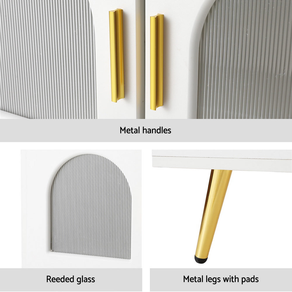 Introducing our contemporary Artiss coffee table with LED strip, USB connectivity, ample storage, sleek metal handles, melamine-coated particle board, reeded acrylic glass door, electroplated metal legs, smooth runners, easy maintenance, and assembly. Modern functionality meets stylish design.