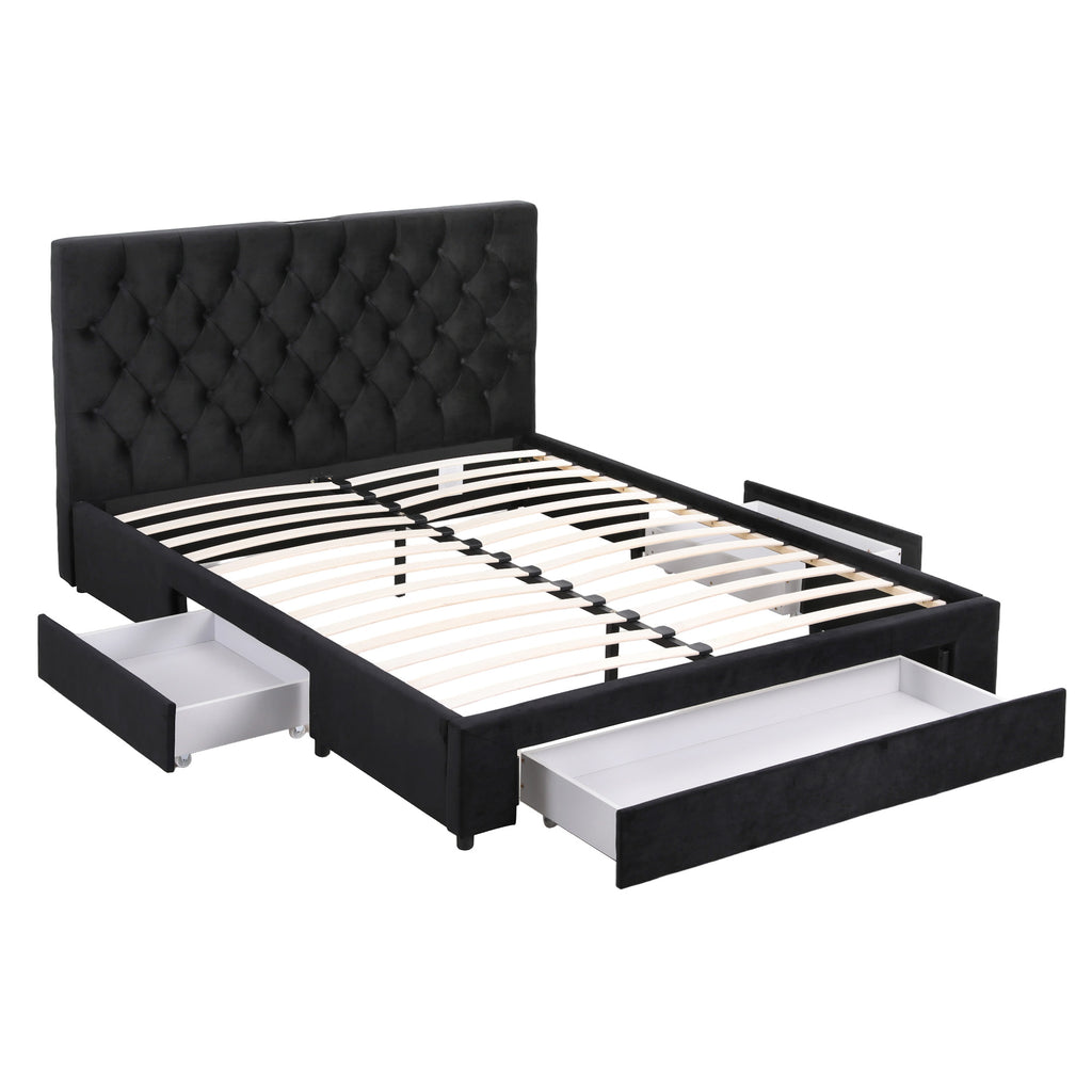 QUEEN UPHOLSTERED BED FRAME with Drawers+Charging Ports