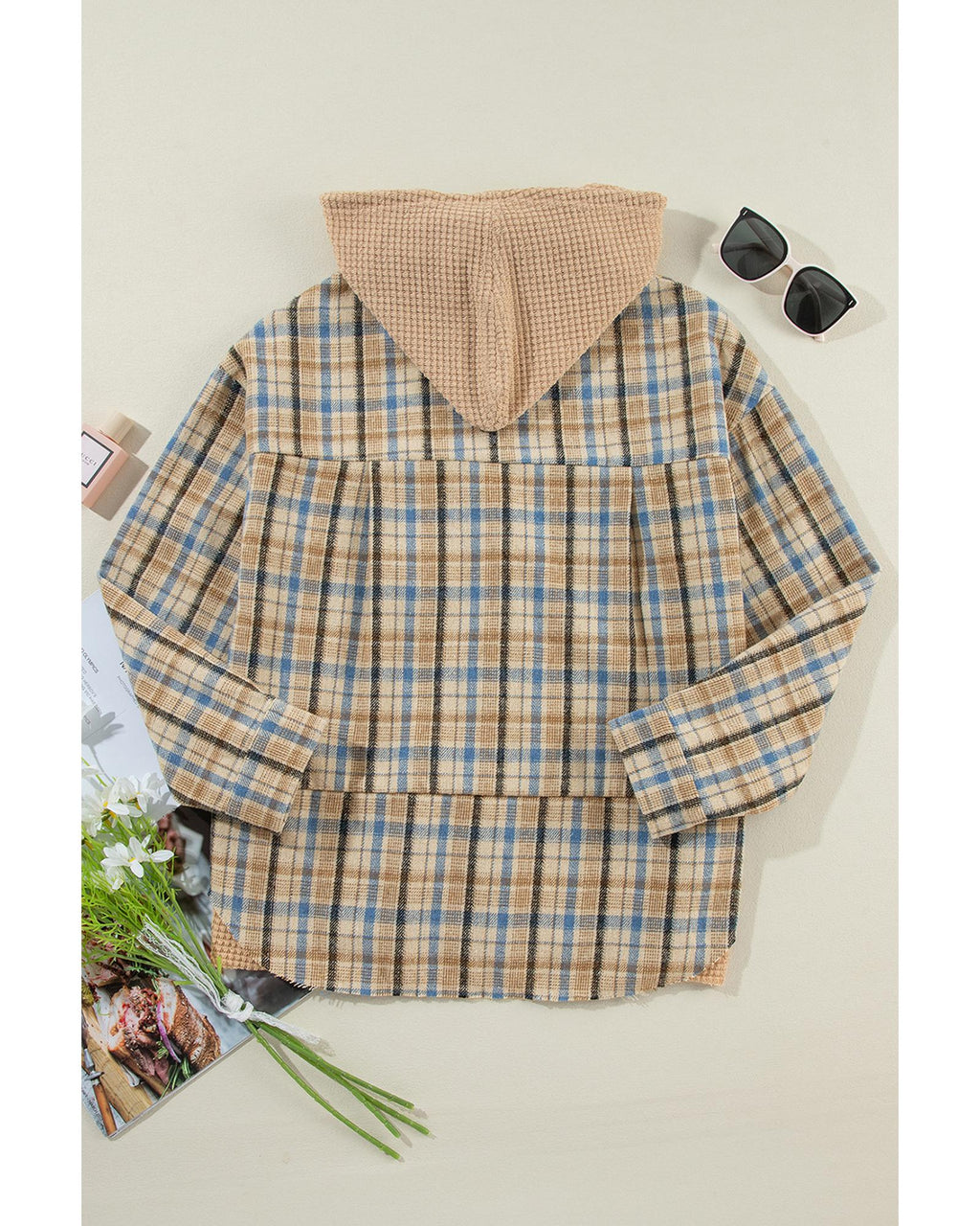 Ashleigh Blue Waffle Knit Patchwork Hooded Plaid Shacket - S