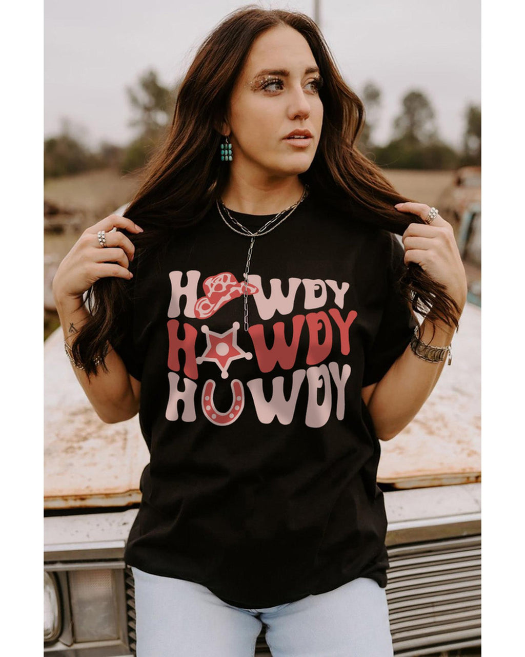 - HOWDY Letter Graphic Print Short Sleeve T-Shirt