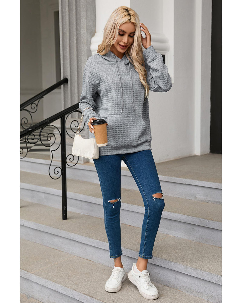 - Womens Lattice Textured Kangaroo Pocket Drawstring Hoodie