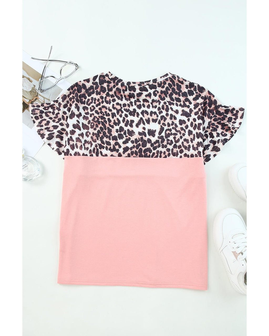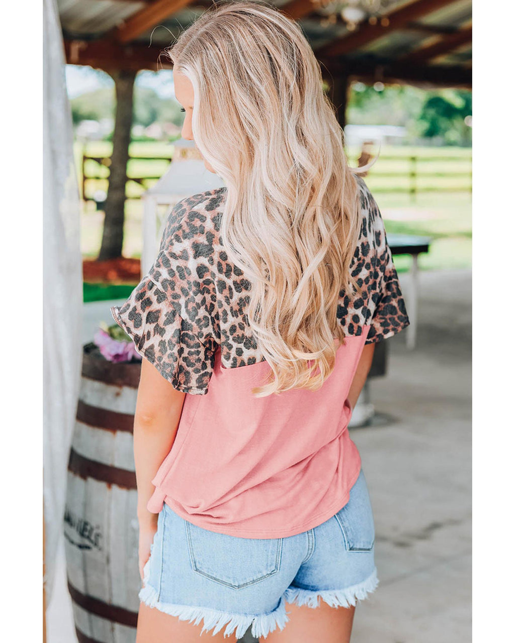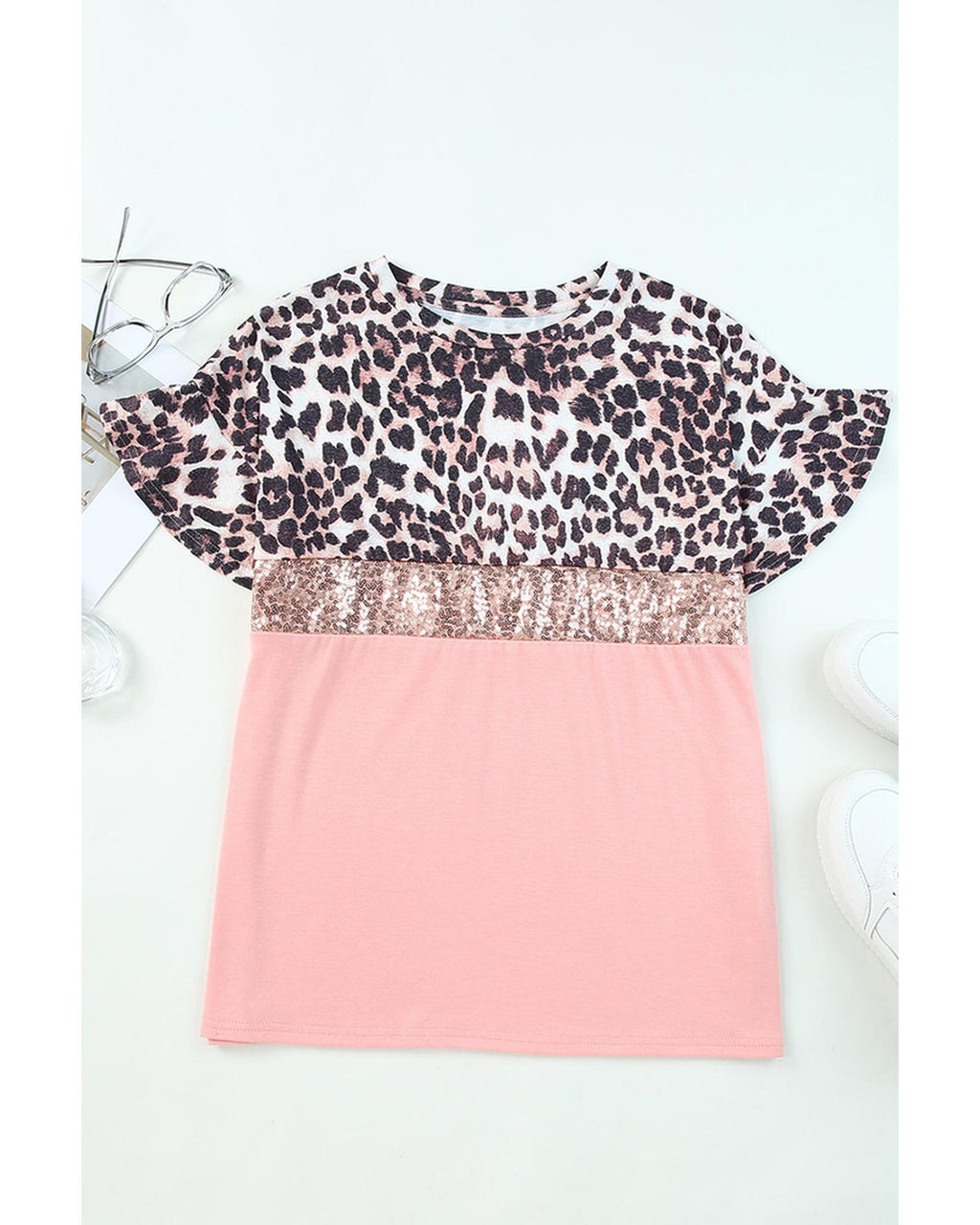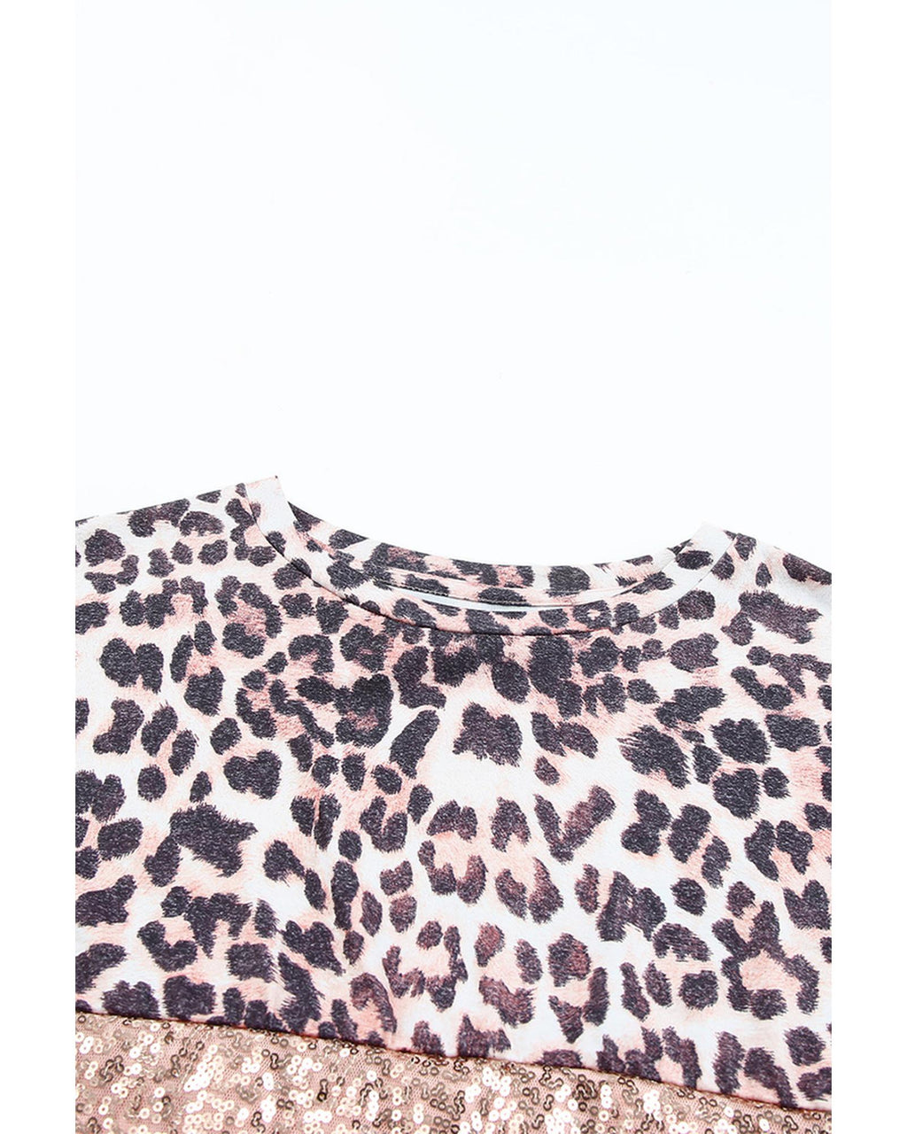 - Luxurious Leopard Sequin Colorblock Patchwork Short Sleeve Top