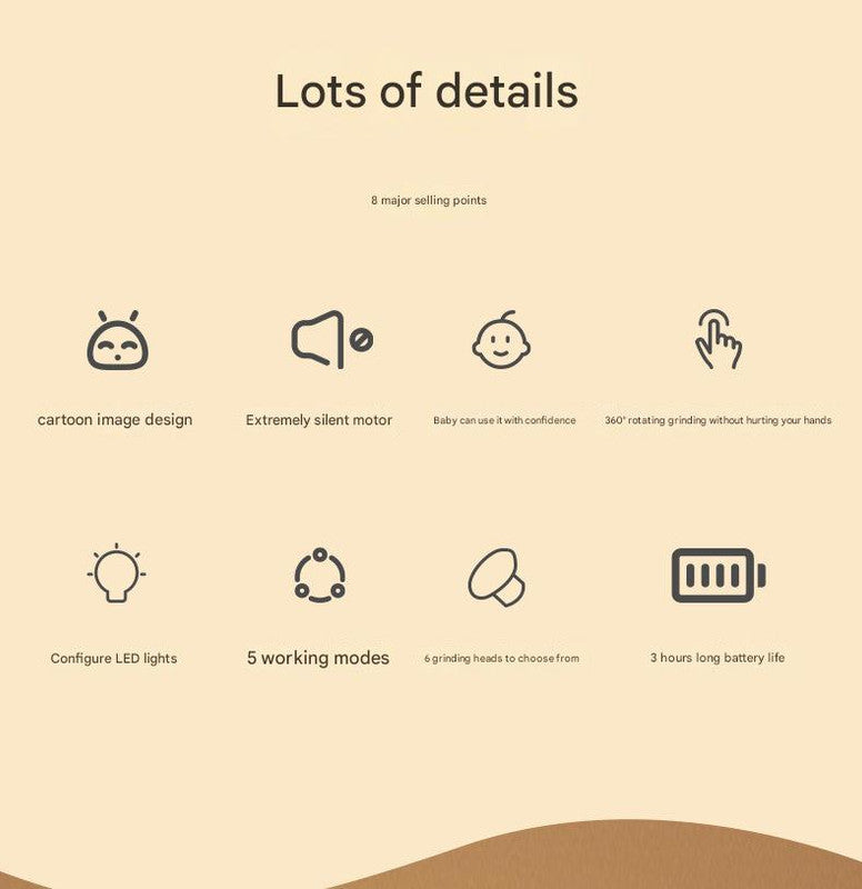 • Buffing/Polishing Head: Polishes baby's nails, cleans cuticles to promote nail growth.