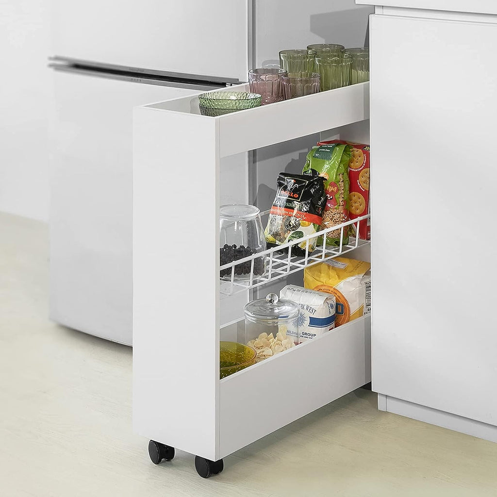 - This convenient storage solution offers plenty of space for all your items. Featuring two shelves and one metal grid basket, you'll have plenty of room for organizing and storing. Plus, the four wheels make it easy to move around, and two of them are equipped with brakes for added stability.