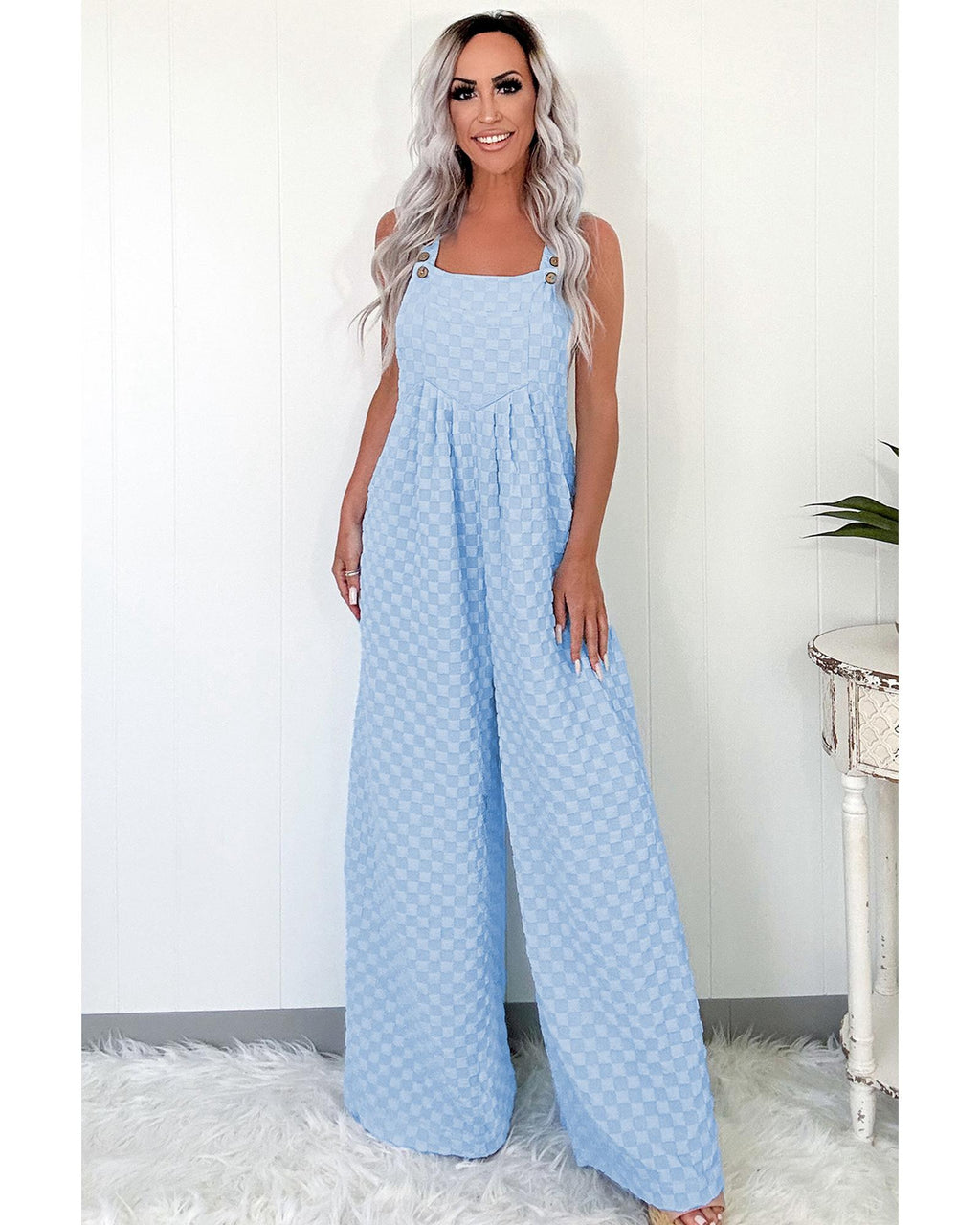 Beau Blue Checkered Pocketed High Waist Wide Leg Overall - S