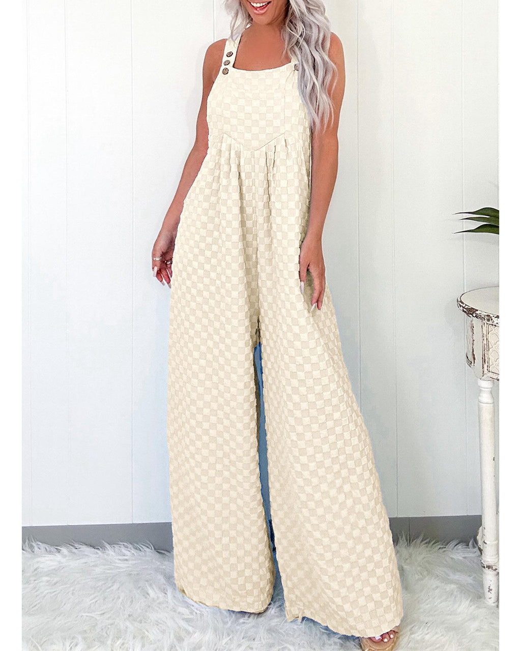Beige Checkered Pocketed High Waist Wide Leg Overall - XL