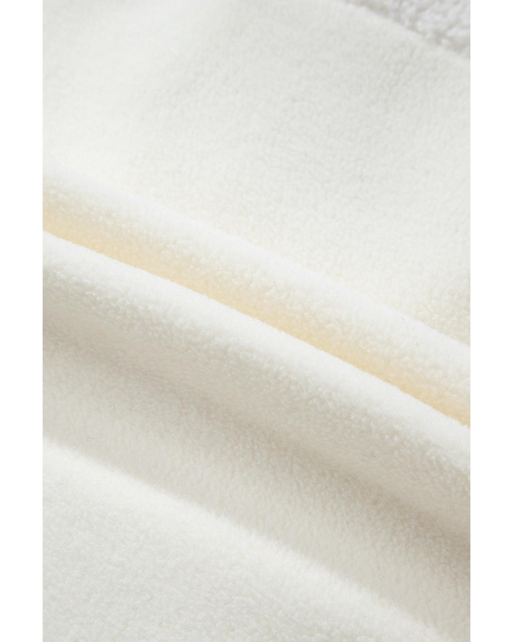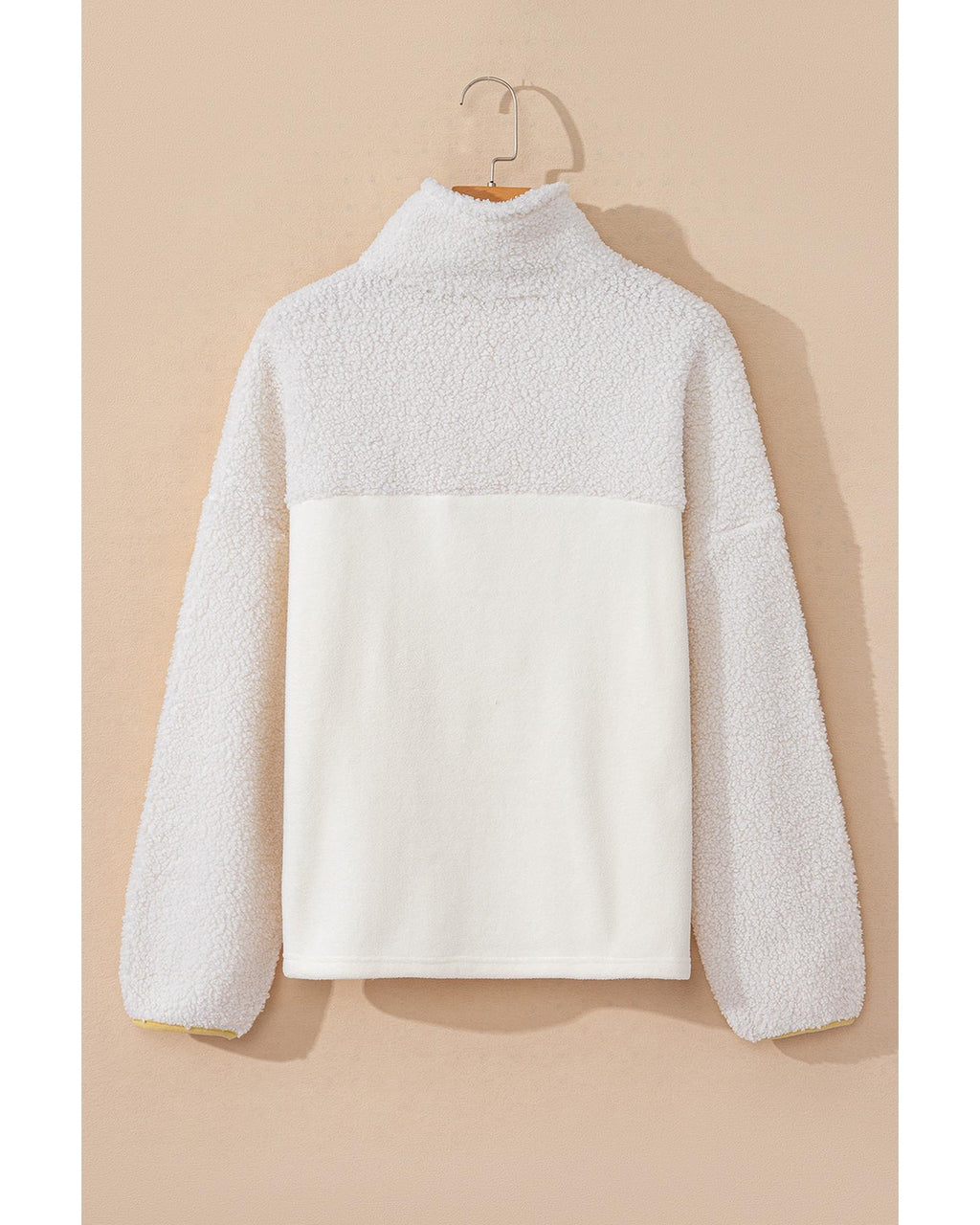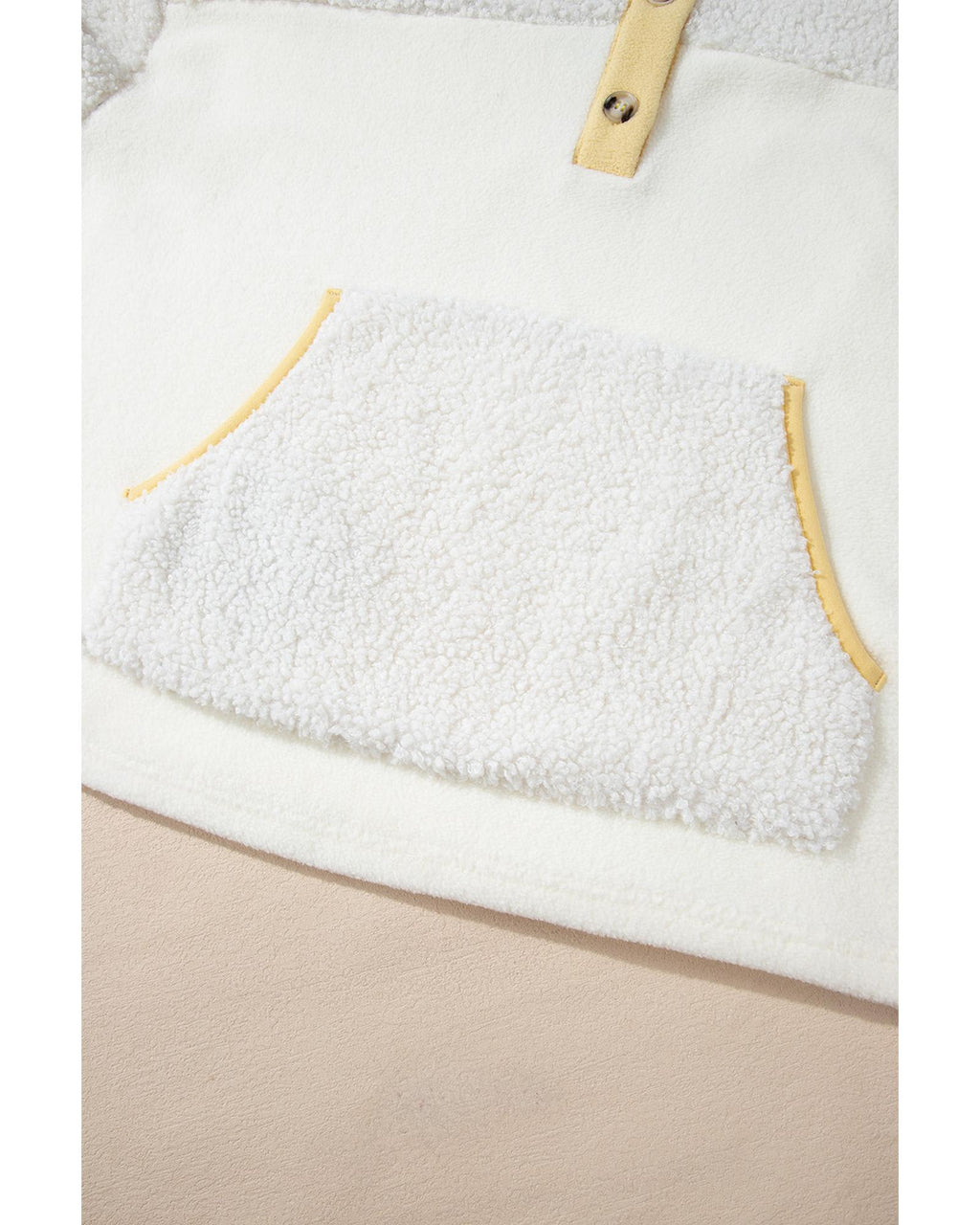 Beige Fleece Colorblock Trim Buttons Collar Sweatshirt with Pocket - L