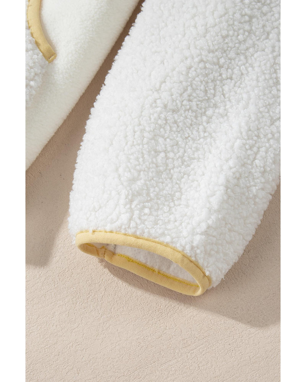 Beige Fleece Colorblock Trim Buttons Collar Sweatshirt with Pocket - M