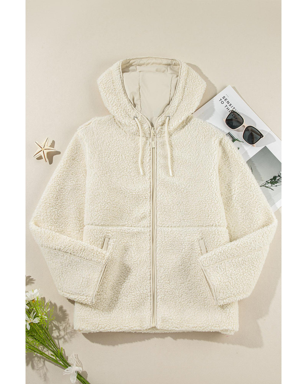 Beige Fleece Zip Up Drawstring Hooded Pocketed Jacket - XL