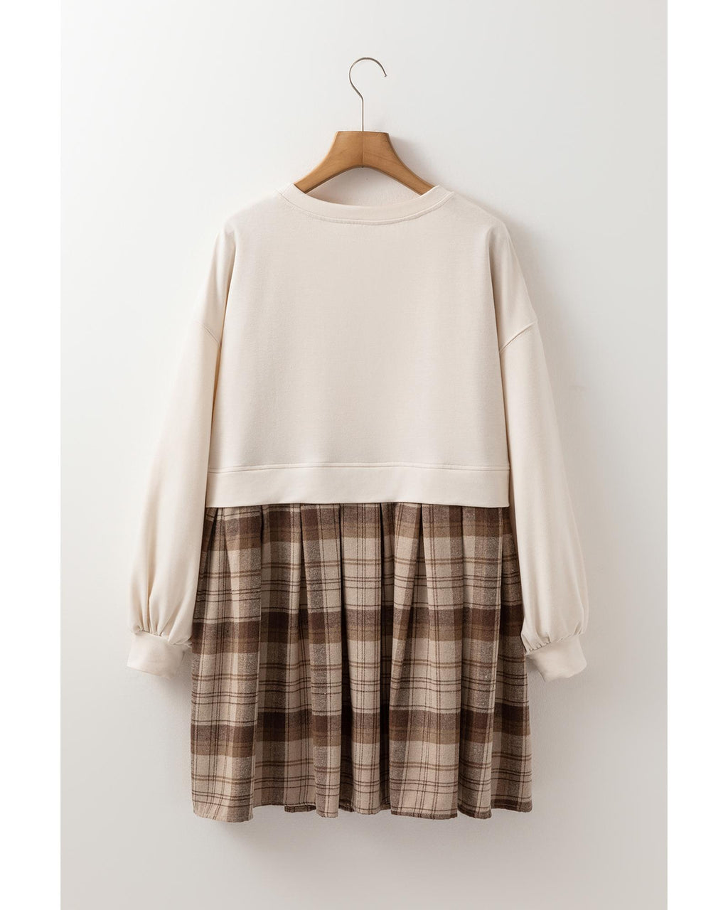 • Beige Plaid Patchwork High Waist Sweatshirt Mini Dress