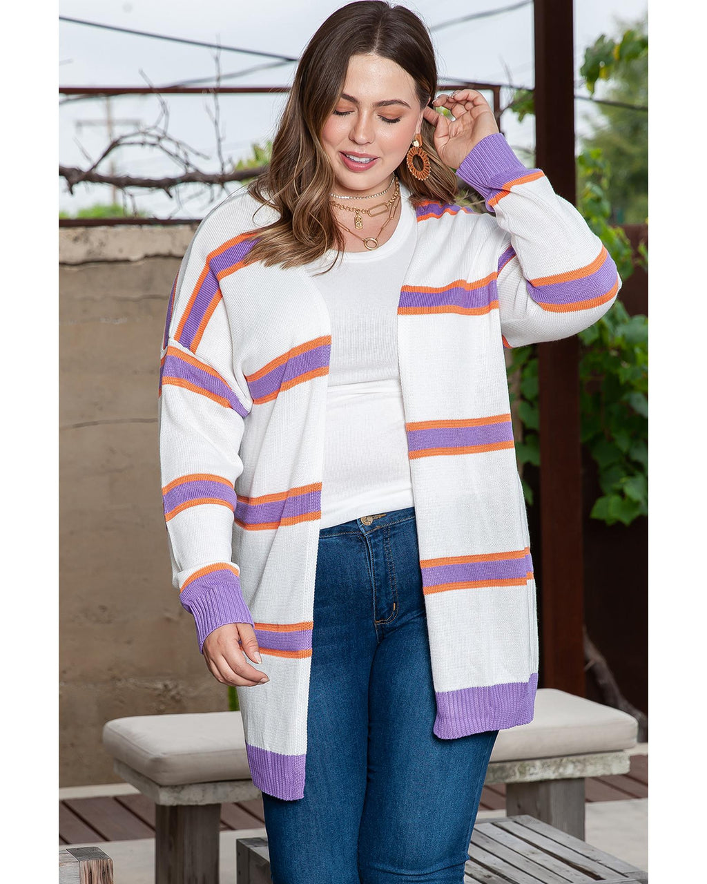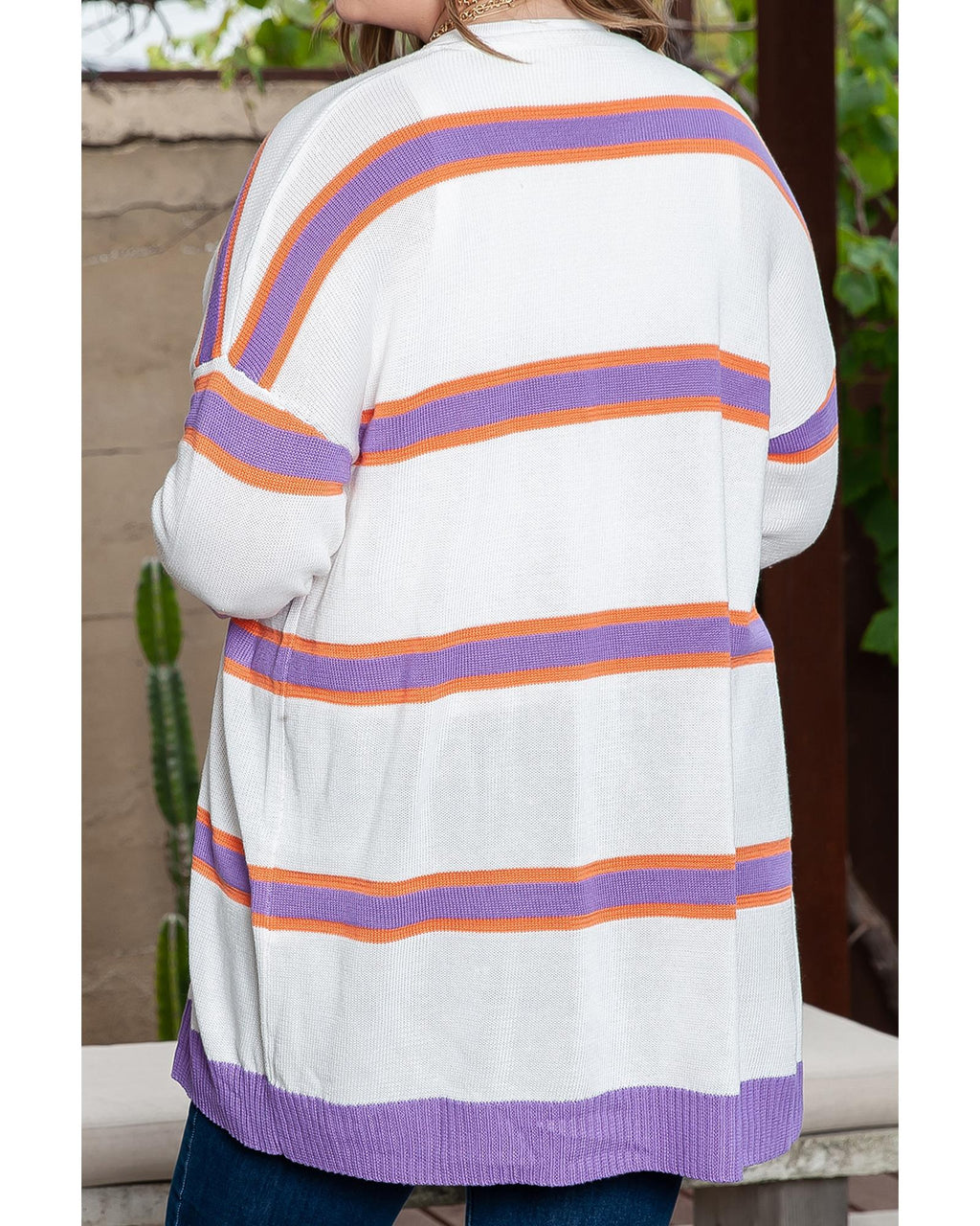 Beige Plus Size Striped Dropped Shoulder Sweater Cardigan - 1X