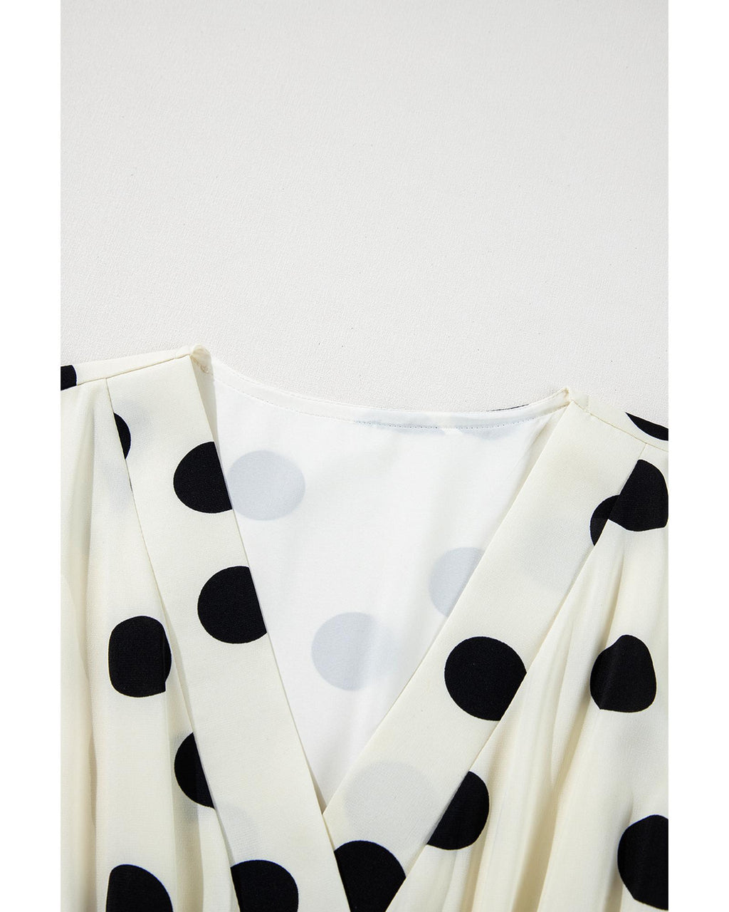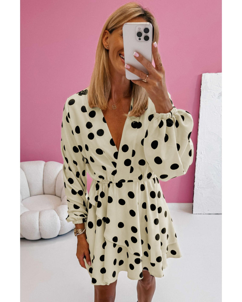 Beige Polka Dot Printed Surplice V Neck Puff Sleeve Mini Dress - XL
