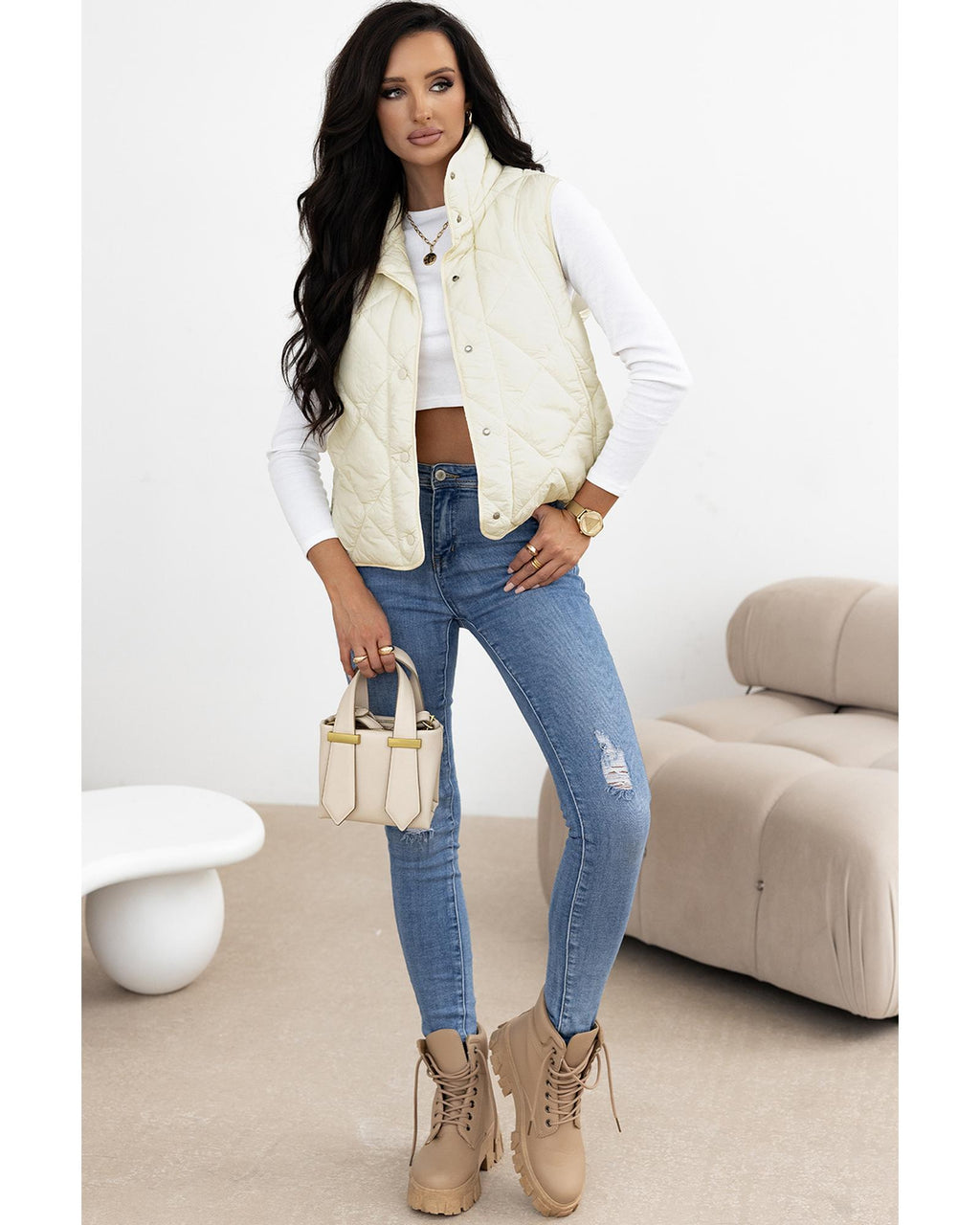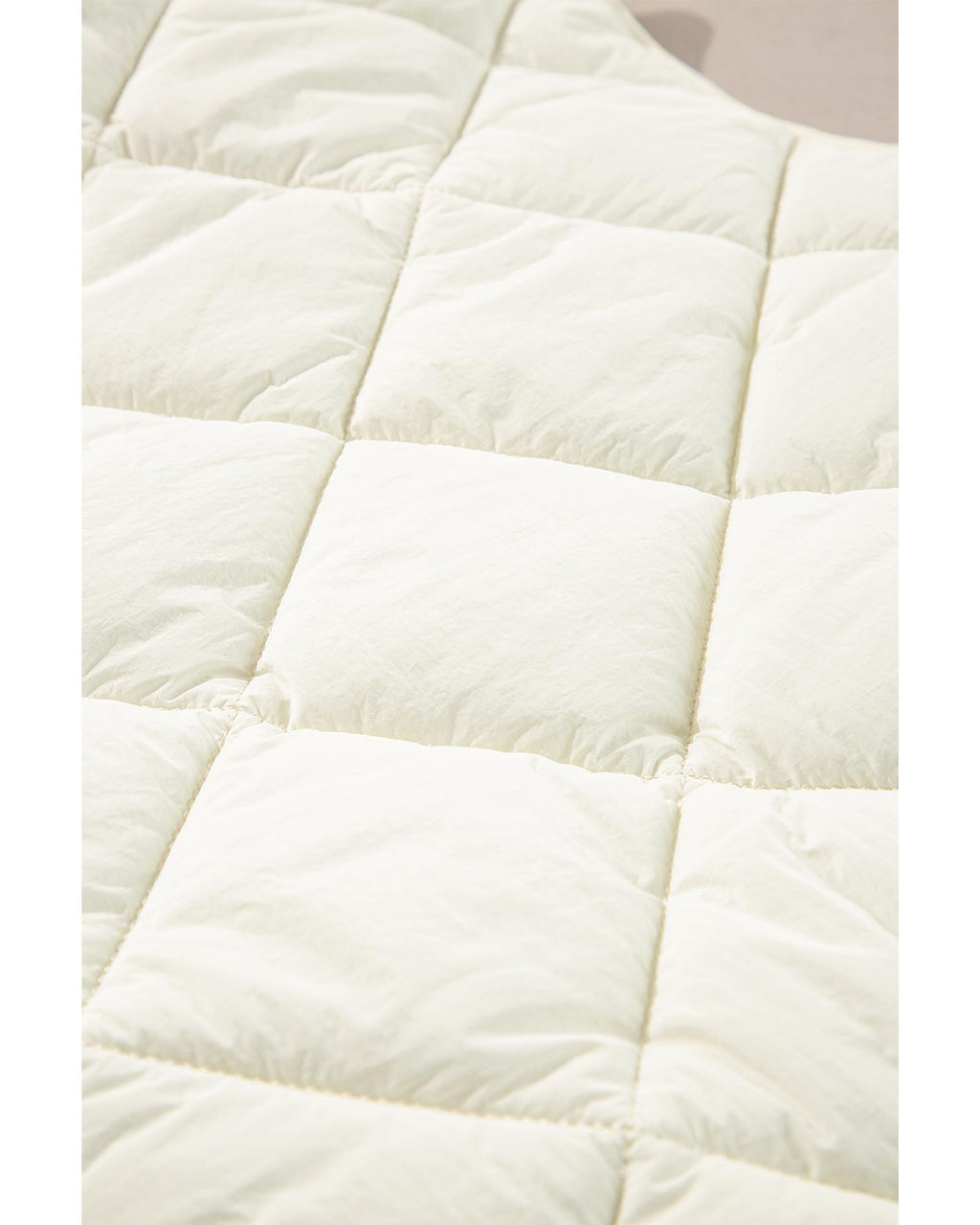 • Beige quilted high neck button up pocket vest coat
