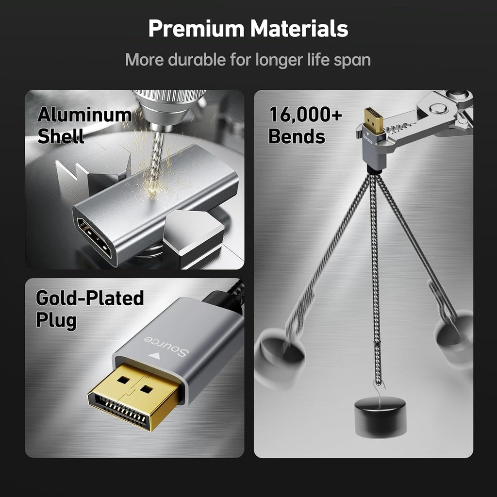 The DisplayPort male to HDMI female converter supports resolutions up to 1920x1080@60Hz (1080p Full HD) including 720p, 1600x1200, 1280x1024 for high definition monitors or projectors, supports flawless audio pass-thru for uncompressed digital 7.1, 5.1 or 2 channels; Gold plated DisplayPort connector resists corrosion and abrasion and improve the signal transmission performance; Molded strain relief increases cable durability