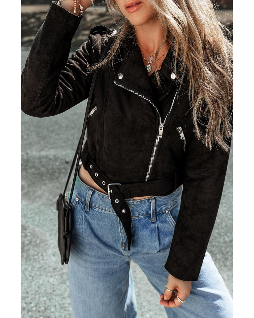 Black Asymmetric Zipper Belted Hem Jacket - M