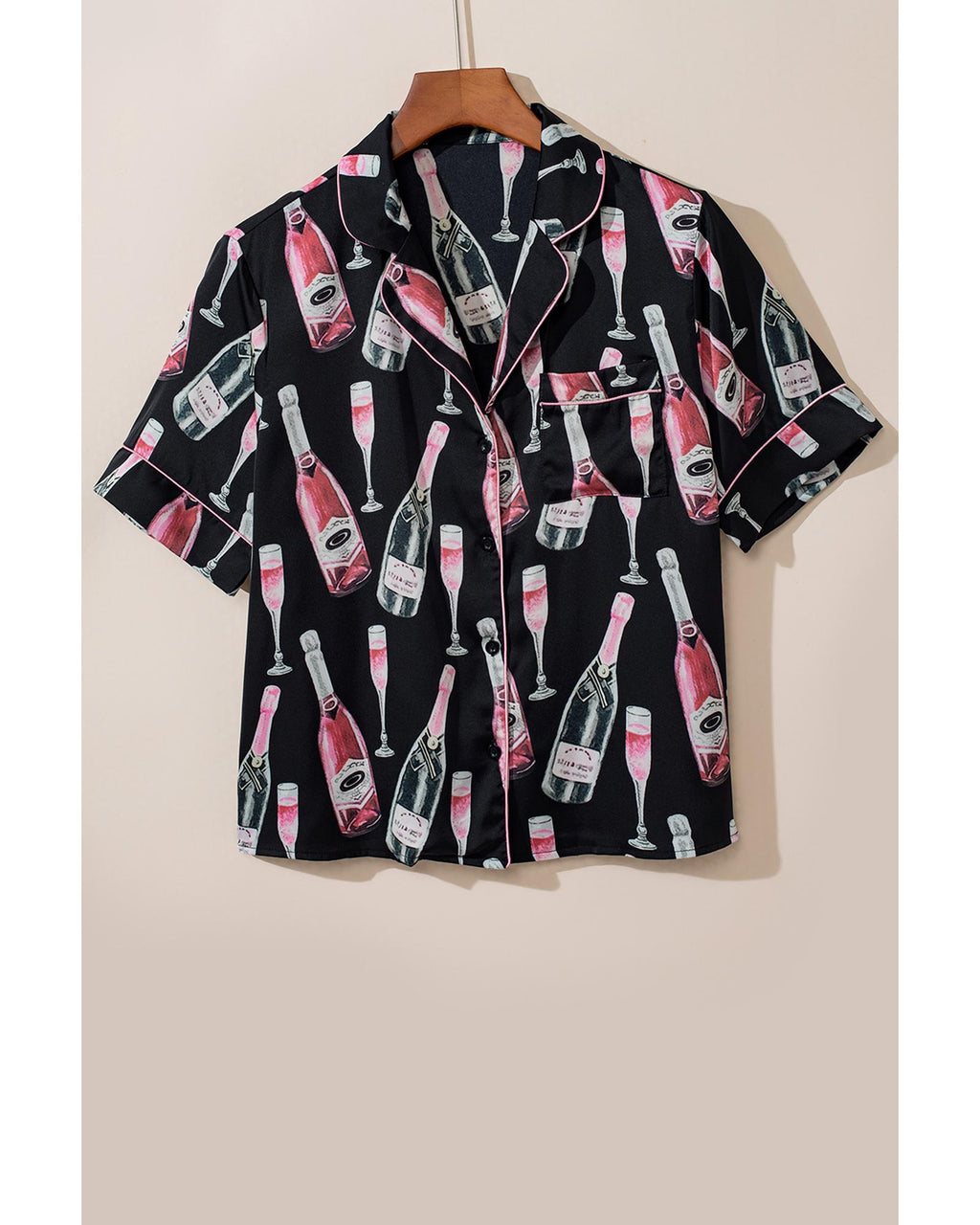 Black Champagne Print Silky Short Sleeve Pajamas Set - L