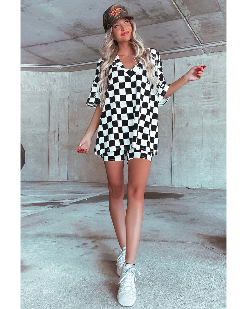 Black Checkerboard Print V Neck Loose Tee and Shorts Lounge Set - L