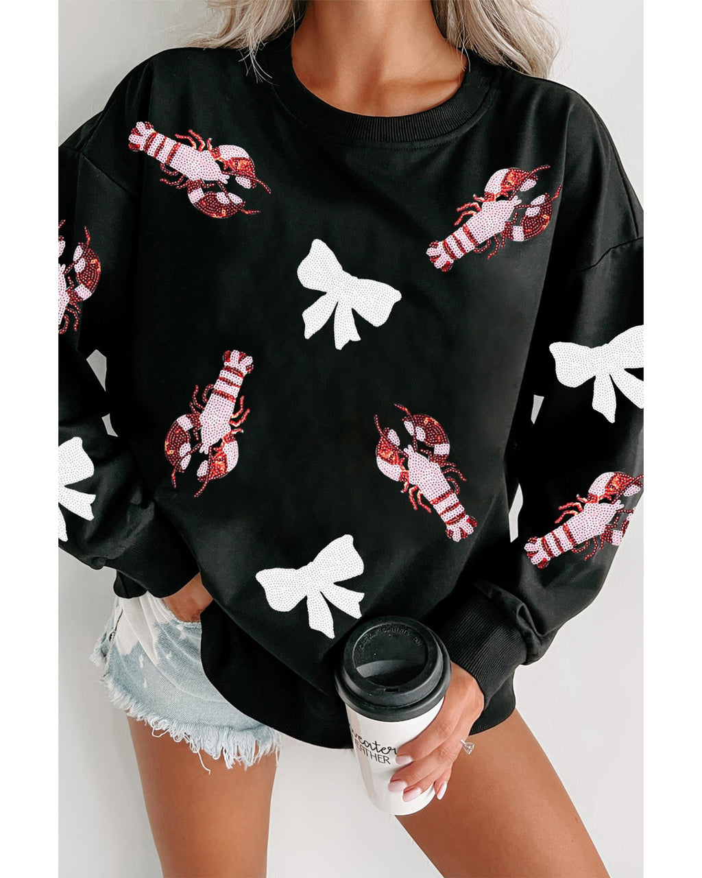 • Black Crawfish Bow Sequin Patched Graphic Sweatshirt