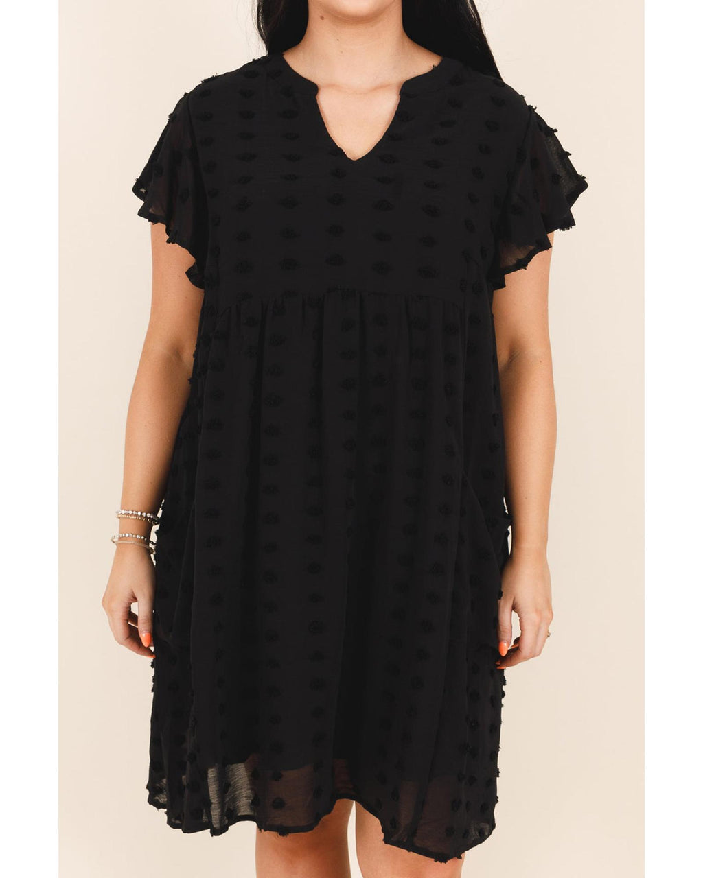 Black Dotty Textured Notched Neck Plus Ruffled Dress - 1X