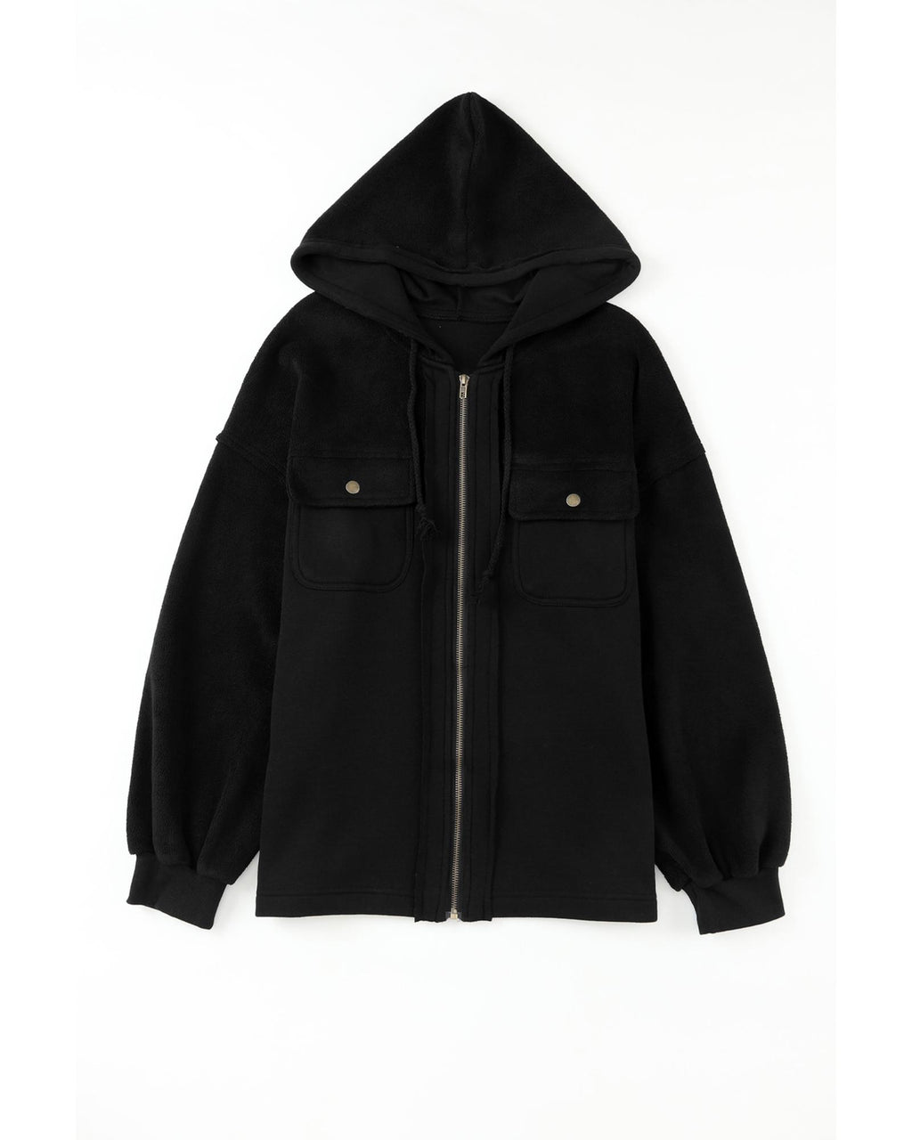 Black Flap Pocket Drawstring Hood Zip Up Jacket - S